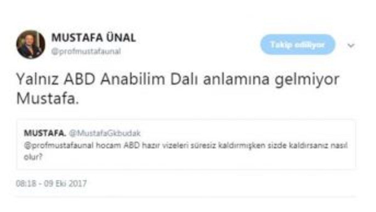 Rektör Prof. Dr. Mustafa Ünal ile bir öğrencisi arasında, ABD'nin Türkiye'den vize başvurularını askıya almasıyla ilgili güldüren bir diyalog yaşandı. Öğrenci, Rektör Prof. Dr. Ünal'a esprili tweet atarak, 'Hocam, ABD hazır vizeleri süresiz kaldırmışken siz de kaldırsanız nasıl olur?' diye sordu. Rektör Ünal da öğrencisine esprili bir yanıt vererek, 'Yalnız ABD, Anabilim Dalı anlamına gelmiyor Mustafa' diye yazdı.