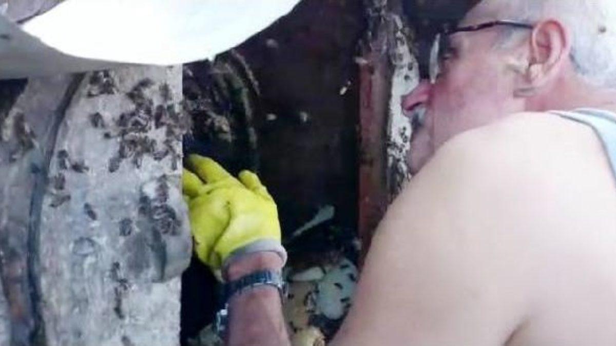 Muhammet KAÇAR/ ÇAMLIHEMŞİN (Rize), (DHA)- RİZE’nin Çamlıhemşin İlçesi Ayder Yaylası’nda alabalık çiftliği işleten Pazar İlçe Ticaret ve Sanayi Odası Başkanı Mustafa Memoğlu, koruyucu giysi ve şapka olmadan atletli halde, binlerce arının bulunduğu kovandan bal sağımı yaptı.