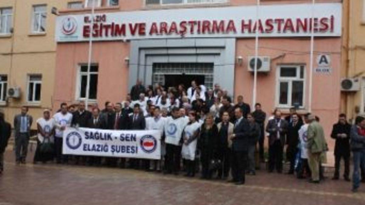 Sağlık Sen Elazığ Şubesi üyeleri, 14 Mart Tıp Bayramı dolayısıyla Elazığ Eğitim ve Araştırma Hastanesi bahçesinde toplandı. Sloganlar atan sağlık çalışanları haklarının iyileştirilmesi konusunda taleplerini dile getirdi.Sağlık Sen Elazığ Şubesi Başkanı Mehmet Karataş, sağlık çalışanlarının iyi olmayan şartlarda görevlerini yapmaya çalıştıklarını belirterek, ''Bizler sağlık çalışanları olarak uzun çalışma saatleri, şiddete maruz kalma, maaşlarımızdaki yetersizlik gibi konularda sorunlarımızı defalarca dile getirdik. Ancak çalışma şartlarımızda bir düzeltme yapılmadı. Şartlarımız iyi olmamasına rağmen en iyi sağlık hizmetini vermeye çalışıyoruz" dedi.Sağlık Sen üyeleri daha sonra sessizce dağıldı.