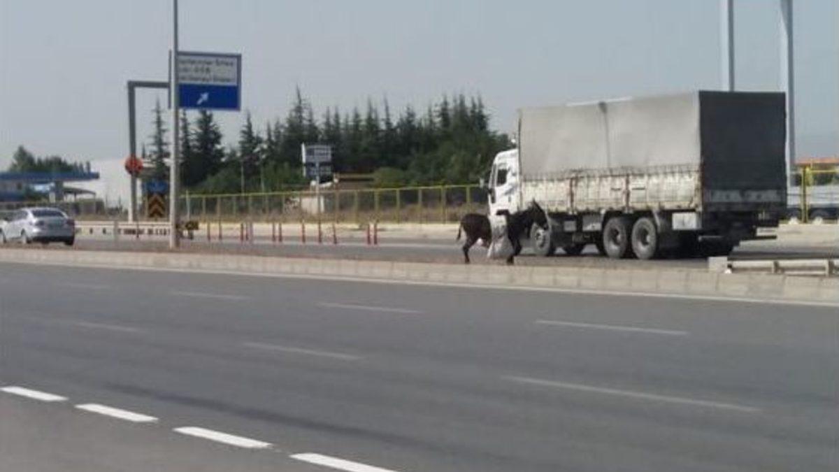 Eskişehir’de çevre yolunda karşıdan karşıya geçmeye çalışan eşek, sürücülere zor anlar yaşattı.Çevre yolunda karşıya geçmek isteyen eşek, trafiği tehlikeye sokarken, sürücüleri de tedirgin etti. Karşıya geçerken araçlara çarpılma riski olan sahipsiz eşek, oluşacak büyük kazalara da adeta davetiye çıkardı. Bir vatandaş tarafından cep telefonu ile fotoğrafı çekilerek sosyal medyada paylaşılan, can ve mal kaybına yol açabilecek eşeğin bu yolculuğu çevredeki sürücü ve vatandaşları endişelendirdi. Bu gölge daha önce ise başı boş atlar ölümlü kazalara neden olmuştu.