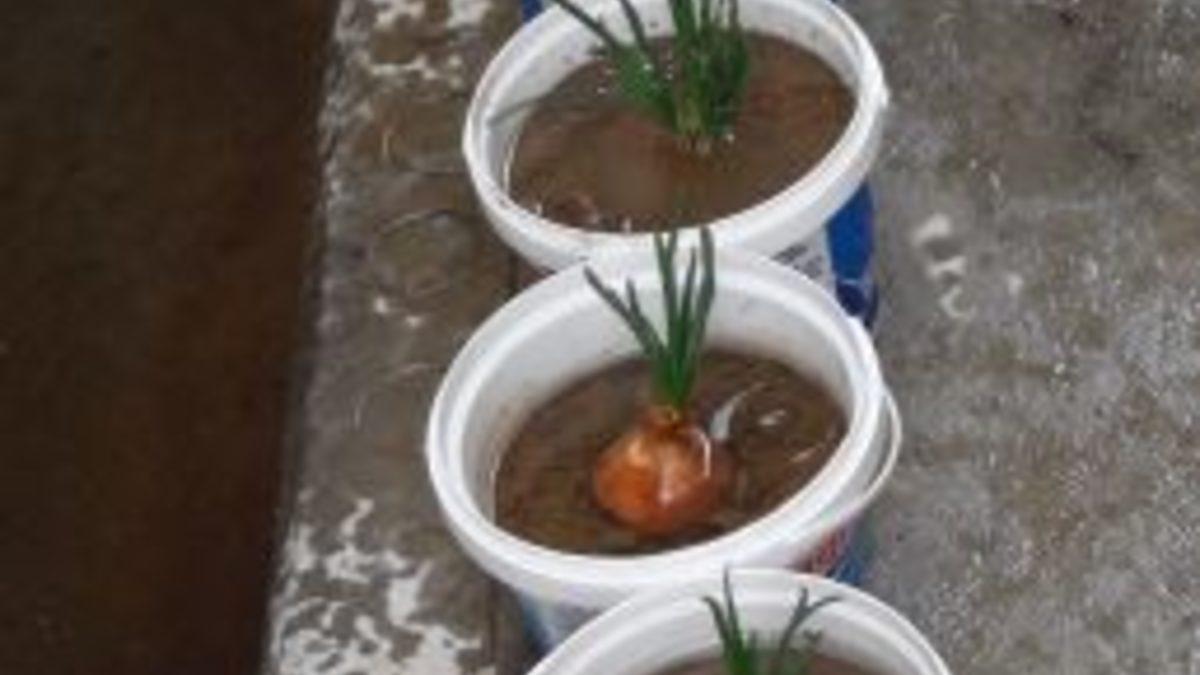 Saksılarda Soğan Yetiştiriyor