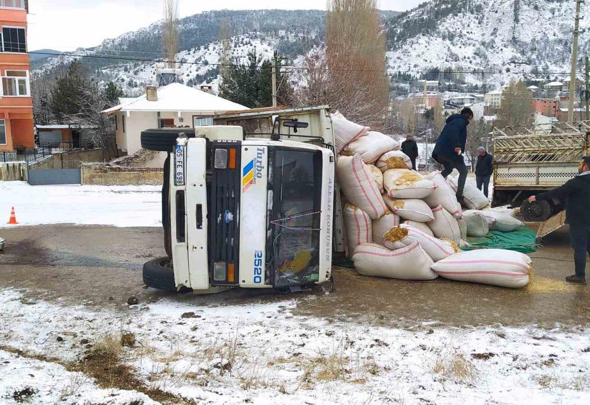 Edinilen bilgiye göre, sabah saatlerinde Sivas’tan Giresun’un Alucra ilçesine getirilen saman yüklü Şamil Aslan yönetimindeki 05 FE 698 plakalı kamyon, oluşan gizli buzlanma nedeniyle kontrolden çıktı. İlçe merkezindeki Yunus Emre Mahallesinde kontrolden çıkan kamyon kayarak devrildi. Kamyonda bulunan araç sürücüsü yaralandı.