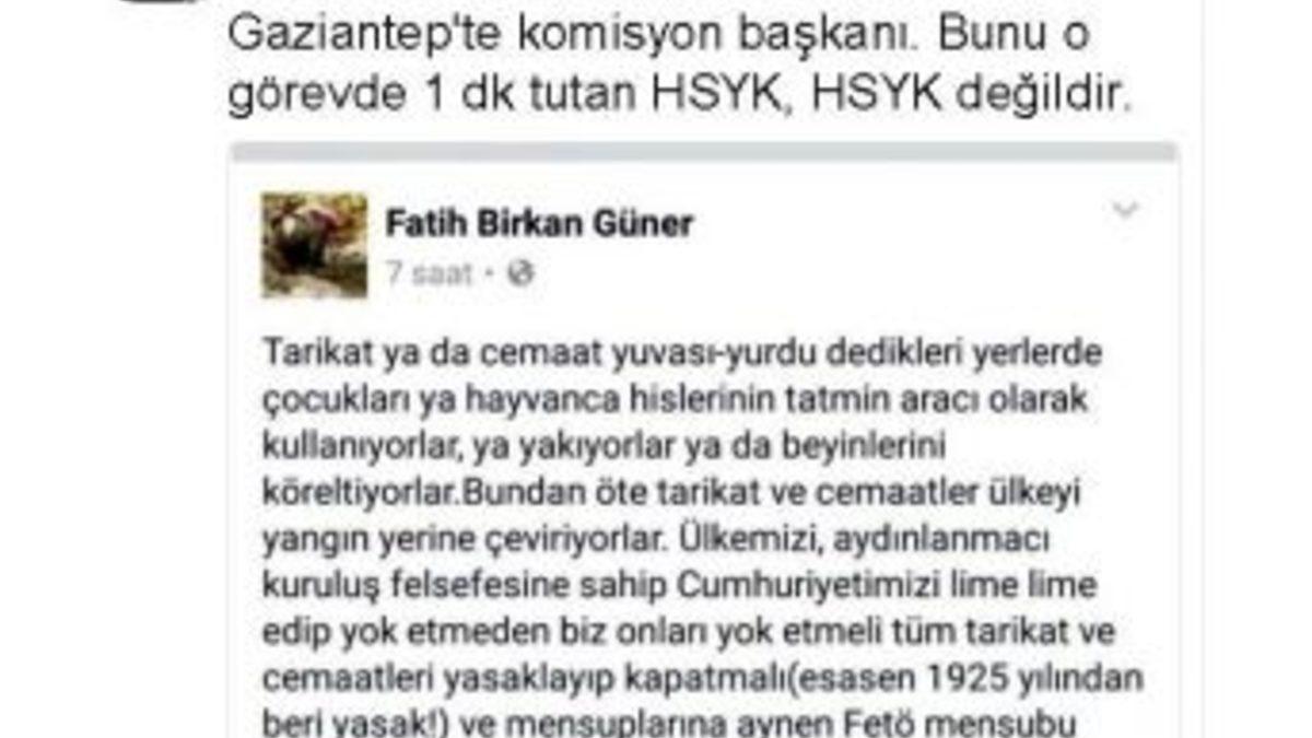 AK Parti Gaziantep Milletvekili Şamil Tayyar, Adalet Komisyonu Başkanı Hakan Birkan Güner’in paylaşımına tepki gösterdi.AK Parti Gaziantep Milletvekili Şamil Tayyar, kendi sosyal medya hesabından yaptığı paylaşımda Gaziantep Adalet Komisyonu Başkanı Hakan Birkan Güner’in ismiyle yayınlanan yorumu paylaşarak, HSYK’a çağrıda bulundu. Tayyar sosyal medya hesabından, "Bu adam maalesef hakim, üstelik Gaziantep’te komisyon başkanı. Bunu o görevde 1 dk tutan HSYK, HSYK değildir" mesajını takipçileri ile paylaştı.