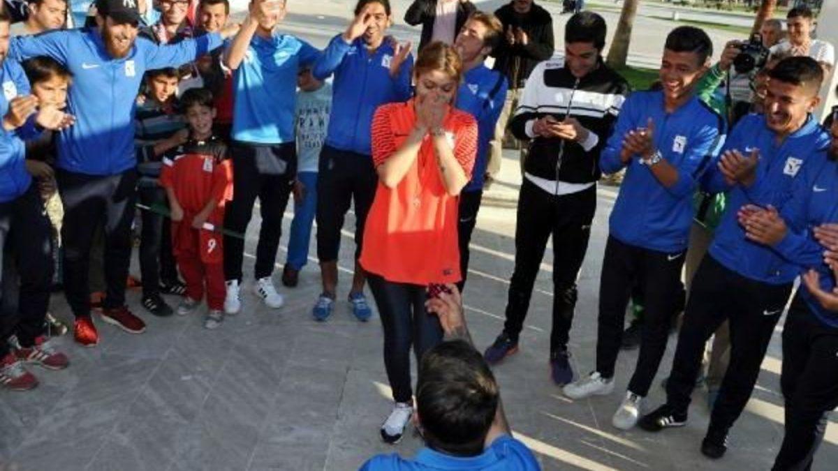 - ANTALYA Süper Amatör Play-Off Grubu'nu şampiyon tamamlayan Manavgat Belediyespor'un şampiyonluk kutlaması sırasında kaleci Uğurcan Kadir Mutlu, kız arkadaşı Arife Buse Koç'a sürpriz evlilik teklifi yaptı.