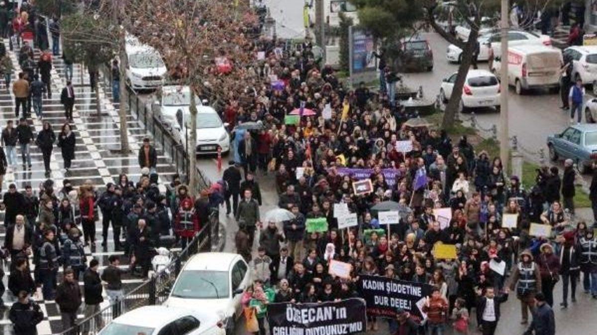 Polislerin yakasına siyah kurdela taktığı görülürken, kalabalık daha sonra alkış ve zılgıtlar eşliğinde Ahmet Bahçıvan İş Merkezi'ne doğru yürüyüşe geçti. Zaman zaman kadına şiddeti protesto eden slogan atan kalabalığın 1 kilometre süren yürüyüşünün ardından konuşan avukat Esra Yurum, kadına şiddetin sona ermesini isteyerek, "Özgecan’ın şahsında tecavüze uğratılmak istenen ve katledilen tüm insanlıktır. Kadına karşı işlenen suçlar, kadın katliamları, intihar ve cinayet olayları ülkemizde son yıllarda azalmak ve sona ermek şöyle dursun, her ölüm gerekçelendirilmeye çalışılmış ve sorun kadının kendisinde aranıp, çözümden uzaklaşılmıştır" dedi.