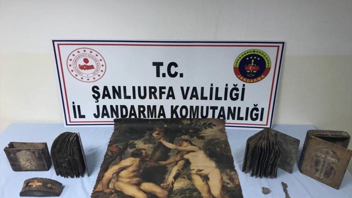 Şanlıurfa'nın Eyyübiye ilçesinde düzenlenen tarihi eser kaçakçılığı operasyonunda, Roma dönemine ait olduğu değerlendirilen tablo, el yazması kitap, krom mühür ve anahtar ele geçirildi.