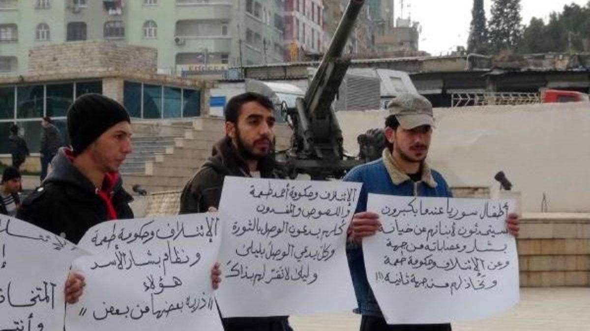 Ali LEYLAK/ŞANLIURFA, Bir grup Suriyeli öğleden sonra Türkiye ve Özgür Suriye bayraklarıyla Topçu Meydanı’nda toplandı. Ellerinde; 'Suriye halkında bir çocuğun tırnağı taşa dediği zaman yüreğimiz sızlıyor. Bizim geçici mecliste geceleri barlarda zevki sefa sürüyor', 'Suriye halkı sefalet içinde, geçici Suriye meclisi çocuklarını Avrupa’da ve dış devletlerde okutuyor', 'Beşar Esad Suriye halkını öldürdü katliamlar yaptı. Geçici Suriye meclisi İstanbul’da yıllardır soygunculuk yapıyor' yazılı Türkçe ve Arapça dövizler taşıyan 100 kişilik grup adına açıklama yapan Muhammed Arap Alhalil şunları söyledi: