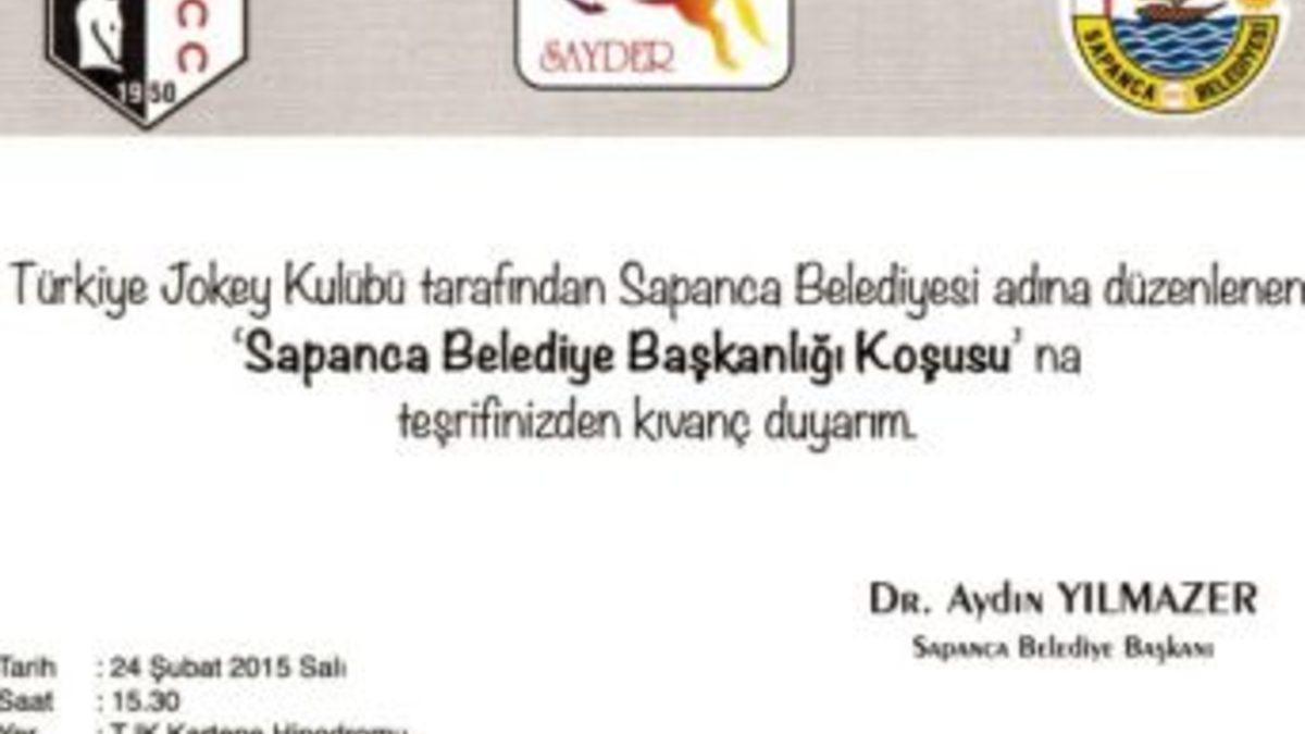 24 Şubat 2015 saat 15:30’da Kartepe Hipodromu’nda Sapanca Belediye Başkanlığı koşusu yapılacak.Her yıl açıklanan TJK programına 24 Şubat Salı günü ilki gerçekleştirilecek olan Sapanca Belediye Başkanlığı koşusu her yıl TJK programında yer alarak resmi olarak yapılacak. Sapanca Belediye Başkanlığı koşusunu izlemek isteyenler için Belediye Hizmet Binası önünden saat: 14:30’da araçlar ücretsiz olarak kalkacak.