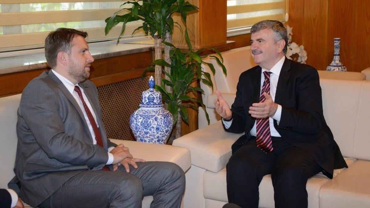 Saraybosna Büyükşehir Belediye Başkanı Abdullah Skaka, Konya Büyükşehir Belediye Başkanı Tahir Akyürek’i ziyaret etti.Ziyaretten duyduğu memnuniyeti dile getiren Büyükşehir Belediye Başkanı Tahir Akyürek, dost ve kardeş toplulukların isimlerini şehirde yaşatarak aradaki bağların unutulmamasını sağlamaya çalıştıklarını dile getirdi. Konya ile Bosna Hersek arasında güçlü bağlar olduğunu, Bosna Hersek, Saraybosna ve Aliya İzzetbegoviç isimli çok sayıda hizmet bulunduğunu hatırlatan Başkan Akyürek, “Saraybosna ve Konya mana olarak birbirine benzeyen şehirler. Bizim için en önemli kardeş şehirlerimizin başında Saraybosna gelir. Türkiye’de yaşanan olaylar Bosna Hersek’i, orada yaşanacak olaylar Türkiye’yi yakından ilgilendirir. İşbirliğini güçlendirmeye ve deneyimleri paylaşmaya devam edelim. Birlikte büyüyelim inşallah” dedi."Bosna Hersek’in ayakta kalmasının en büyük destekçisi ve garantisi Türkiye’nin güçlü olmasıdır"Saraybosna Belediye Başkanı Abdullah Skaka ise, “Konya’nın Bosna Hersek ve Saraybosna için yaptıkları için minnettarız. Saraybosna sizin desteklerinizle şu an daha yaşanabilir bir şehir konumunda. Gönüllerimiz ve hizmetlerimiz bir. Türkiye’de son dönemde yaşananlar sadece Türkiye için değil, dünya için önem arz ediyor. Son referandumda Konya olarak aldığınız yüksek rakam nedeniyle sizleri tebrik ediyorum. 15 Temmuz darbe girişiminde yaşananları bizler de endişe ile yakından takip ettik. Bosna Hersek’in ayakta kalmasının en büyük destekçisi ve garantisi Türkiye’nin güçlü olmasıdır. Türkiye için de istikrarlı bir Bosna Hersek çok önemlidir” diye konuştu.Saraybosna’da çarşıya çıkan herkesin Konya’nın verdiği tramvayları gördüğünü belirterek, verilen destek için teşekkür eden Skaka, iki şehir arasındaki ilişkileri bir adım daha ileri taşımak istediklerini ifade etti. Büyükşehir Belediye Başkanı Tahir Akyürek, ziyaretin sonunda Saraybosna Büyükşehir Belediye Başkanı Abdullah Skaka’ya Fahri Hemşehrilik Beratı takdim etti.