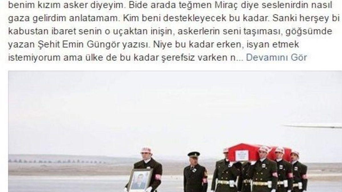 Fırat Kalkanı Harekatı’nda DEAŞ ile girilen çatışmada şehit düşen ve memleketi Denizli’nin Acıpayam ilçesinde toprağa verilen 40 yaşındaki Piyade Uzman Çavuş Emin Güngör’ün kızı Miraç Güngör’ün babasının ardından sosyal medya hesabından duygularını paylaştığı yazı yürekleri dağladı.Fırat Kalkanı Harekatı kapsamında DEAŞ’la girilen çatışmada şehit düşmesinin ardından Denizli’de bugün düzenlenen törenle toprağa verilen şehit Piyade Uzman Çavuş Emin Güngör’ün üç kızından olan Miraç Güngör’ün babasının ardından sosyal medya hebasından paylaştığı yazı yürekleri burktu. 15 yaşındaki Miraç Güngör, sosyal medya hebasından dün Çardak Havalimanı’nda yapılan törende babasının al bayrağa sarılı tabutunun askerlerin omzunda taşındığı bir fotoğraf paylaştı. Miraç paylaşımında, "Dayanamıyorum baba, inan dayanamıyorum. Çok hayalimiz vardı, ne güzel hayallerimiz vardı. Sanki her şey bir kabustan ibaret, senin o uçaktan inişin, askerlerin seni taşıması, göğsümde yazan Şehit Emin Güngör yazısı" ifadelerine yer verdi.“Baba canın çok mu yandı, çok mu can çekiştin?”Şehidin en büyük kızı olan lise öğrencisi Miraç, babasına şöyle seslendi:“Niye bu kadar erken, isyan etmek istemiyorum ama ülkede bu kadar şerefsiz varken niye sen. Benim artık koşulsuz şartsız güvenebileceğim bir erkek yok hayatımda. Ya da kapı gibi babam var bana bir şey olmaz diyemeyeceğim. O kadar çok istiyorum ki son kez sarılmak, doya doya öpmek, o güzel yüzünü son kez görmek istiyorum. Yarın göreceğim, yüzünde bir şey yokmuş öyle diyorlar. Baba çok mu yandı canın, çok mu can çekiştin.”“Açmayacağını bildiğim telefonu aradım, görmeyeceğini bildiğim bir sürü mesaj attım”Şehit babasına son kez seslenen Miraç, “Ben dün açmayacağını bildiğim telefonunu aradım, görmeyeceğini bildiğim bir sürü mesaj attım. Hala şaka gibi geliyor sanki, yine arayacağım, yeni paylaştığım fotoğrafa laf edeceksin, yaptığım makyaja, giydiğim kıyafete huysuzlanacaksın. Yine telefonla çok oynamama kızacaksın. Baba umarım kalbini kıran bir söz söylememişimdir. Seni çok seviyorum biliyorsun demi, çok seviyoruz. Sen bizi hep izliyorsun onu da biliyorum. O kağıdı mezarına mı bıraksam yoksa bende mi kalsa bilmiyorum. Hayalim gelince boynuna atlayıp vermekti. Olmadı. Ve hakkını yiyenlerin vicdanını rahatlatmak için yapmacık üzüntüleri ayrı bir olay. Bunun öbür dünyası var baba üzme kendini. Dün gece çok çığlık attım gökyüzüne belki sesim sana ulaşır diye. Biricik kızın” dedi.