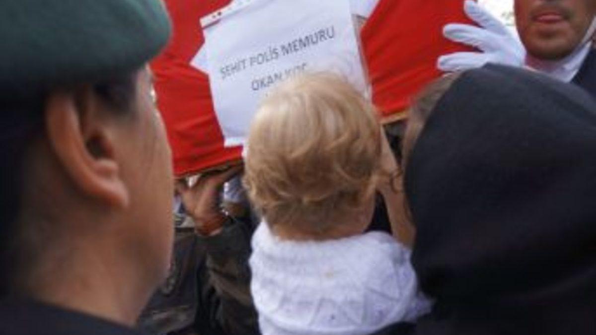 Şehit cenazeleri omuzlarda taşınırken'"Şehitler ölmez vatan bölünmez. Kahrolsun PKK' sloganları atıldı. Şehit polis memuru Okan Koç'un 6 aylık kızı Nehir de babasının tabutu taşınırken ona son kez dokundu. Bu sırada duygusal anlar yaşandı. Şehit naaşları cenaze araçlarına konulduktan sonra bir bayan vatandaş, dua etti.