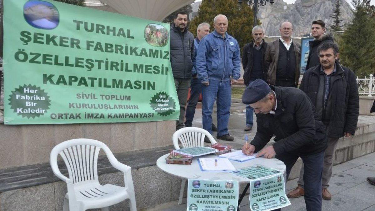 Tokat’ta Şeker-İş Sendikası tarafından, Cumhurbaşkanı Recep Tayyip Erdoğan’a gönderilmek üzere Turhal Şeker Fabrikasının özelleştirilmemesi için imza kampanyası başlatıldı.Aralarında Turhal Şeker Fabrikasının da bulunduğu ülke genelindeki toplam 14 şeker fabrikası ile ilgili yapılan özelleştirme çalışmalarının başlatıldığına dair açıklamalar sonrasında, Şeker-İş Sendikası tarafından merkez ilçe dahil Tokat’ta 12 ilçede eş zamanlı olarak imza kampanyası başlatıldı. Şeker-İş Sendikası Turhal Şube Başkanı Nurullah Alpat, Turhal Şeker Fabrikasının özelleştirme süreciyle ilgili yaptığı açıklamada sigara fabrikasının kapanmasının Tokat ekonomisine verdiği olumsuz etkiye dikkat çekerek, aynı durumun Turhal Şeker Fabrikasında da yaşanmasının kentin ekonomisini ciddi anlamda etkileyeceğini söyledi. Alpat, “Sigara fabrikasında 5 yıl çalıştırılma şartı konmuş ama 1 yıl zor dayanmıştı. Hepimiz gördük. Şeker Fabrikasının da akıbetinin aynı olacağını duyurmak istiyorum. Şeker fabrikası Tokat ekonomisine çok büyük katkı sunan 100 yıllık manevi bir değerdir. Çok iyi biliyoruz ki; bu özelleştirme değil kapatılmadır" şeklinde konuştu.Turhal Şeker Fabrikasının Tokat ekonomisine sağladığı katkılarla ilgili istatistiki bilgiler de veren Başkan Alpat, “2017 yılında 6 bin 984 çiftçi ile 162 bin 742 dekar alandan 845 bin 440 ton pancar hasadı yapılmış, buna karşılık fabrikada işlenen 848 bin ton pancardan 113 ton kristal şeker, 33 bin 900 ton melas ve 242 ton yaş küspe elde edilmiştir. Kristal şeker fiyatının kilosu 2 lira 79 kuruş, melas kilo fiyatı 48 kuruş, yaş küspe fiyatı ise 8 kuruş olduğuna göre milli ekonomiye 2017 yılında üretilen 845 bin 440 ton pancar için çiftçilere toplamda 169 milyon 367 bin 569 lira ödenmiştir” diye konuştu.