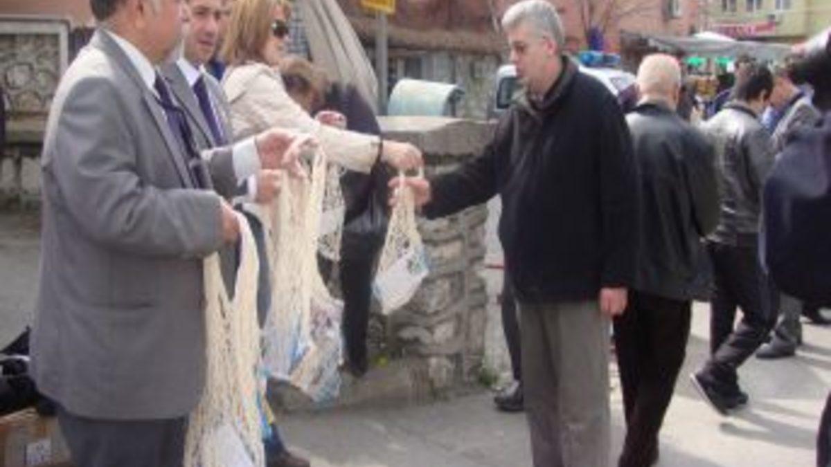 Bursa'da, Osmangazi ve Tophane Rotary ile Rotaract Kulüplerinin üyeleri naylon poşetlerin doğaya verdiği zararlara dikkat çekmek amacıyla Nilüfer Semt Pazarı'nda vatandaşlara ipten üretilen file, pazarcı esnafına da kese kâğıdı dağıttılar.