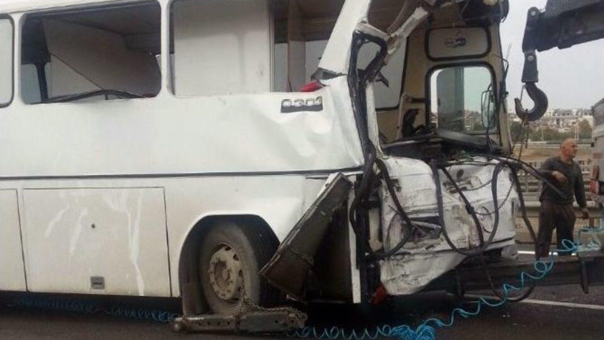 Bursa’da servis otobüsünün tankere çarpması sonucu 5 kişi yaralandı.Edinilen bilgiye göre, saat 13.30 sıralarında meydana gelen kazada servis otobüsü, önünde ilerleyen tankere arkadan çarptı. Kazada otobüste bulunan 5 kişi yaralandı. Olay yerine çağrılan ambulanslarla çeşitli hastanelere kaldırılan yaralıların durumunun iyi olduğu öğrenildi.Bursa otobanının İstanbul ile Mudanya arasındaki bölümünde meydana gelen kaza nedeniyle trafik iki yönlü durma noktasına geldi. Yolda kilometrelerce kuyruk oluşurken, yol yapımı nedeniyle tek şeride düşürülen otobanda yolda kalan sürücüler isyan etti. Yaklaşık 3 saattir tıkalı olan trafik halen açılamadı