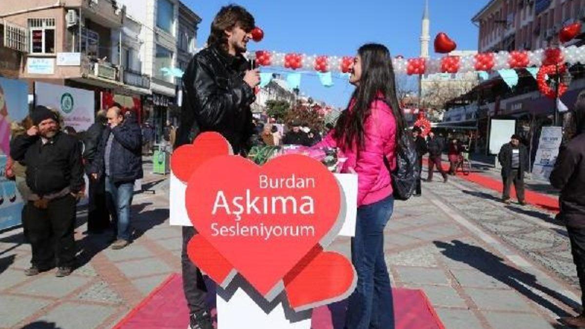 Ali Can ZERAY/EDİRNE, Edirne Belediyesi 14 Şubat Sevgililer Günü'nde trafiğe kapalı Saraçlar Caddesi üzerinde etkinlik düzenledi. Balonlarla ve kalp figürleri ile caddenin boydan boya süslenen caddede kurulan kürsü üzerinde sevgililer birbirlerine aşklarını anlattı, bazıları da kalpten yapılmış platforma sevgi notları yazdı.