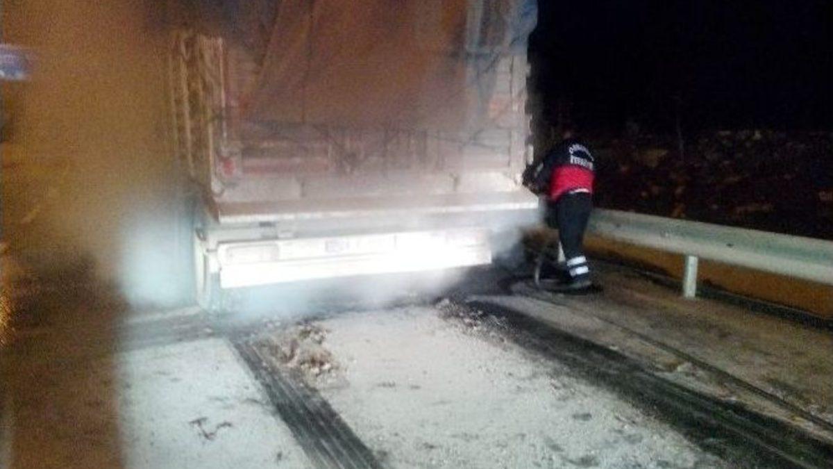 Bilecik’in Osmaneli ilçesinde seyir halindeki bir TIR’ın dorse kısmındaki lastikte yangın çıktı.Edinilen bilgiye göre olay, Osmaneli Kızılöz Köyü kavşağında meydana geldi. Bilecik’ten Sakarya istikametine giden Emre Ö. idaresindeki 26 E 3154 plakalı pancar yüklü TIR’ın sağ arka lastiği henüz bilinmeyen bir nedenden dolayı yanmaya başladı. Lastiklerden sıçrayan kıvılcımlar dorseyi tutuştururken, sürücü Emre Ö., emniyet şeridine çektiği TIR’a kendi imkanları ve olay yerinden geçen diğer sürücülerle birlikte müdahaleye etmeye başladı. İhbar üzerine olay yerine gelen Osmaneli Belediyesi İtfaiye Müdürlüğü ekiplerince kontrol altına alınan yangın, kısa sürede söndürüldü.polis ekipleri, yangın sırasında yoldan geçen başka araçlara zarar gelmemesi için kısa süreliğine yolu ulaşıma kapattı. Dikiz aynasına baktığı sırada yangını fark ettiğini söyleyen sürücü Emre Ö., "Seyir halindeyken aynaya baktım TIR’ın sağ arka lastiği yandığını gördüm. Dorseye ve TIR’a yangın sıçramasın diye emniyet şeridine çekip hemen yangına kendi imkanlarımla söndürmeye çalıştım aynı zaman da polise ve itfaiyeye haber verdim" dedi.Olayla alakalı soruşturma sürüyor.