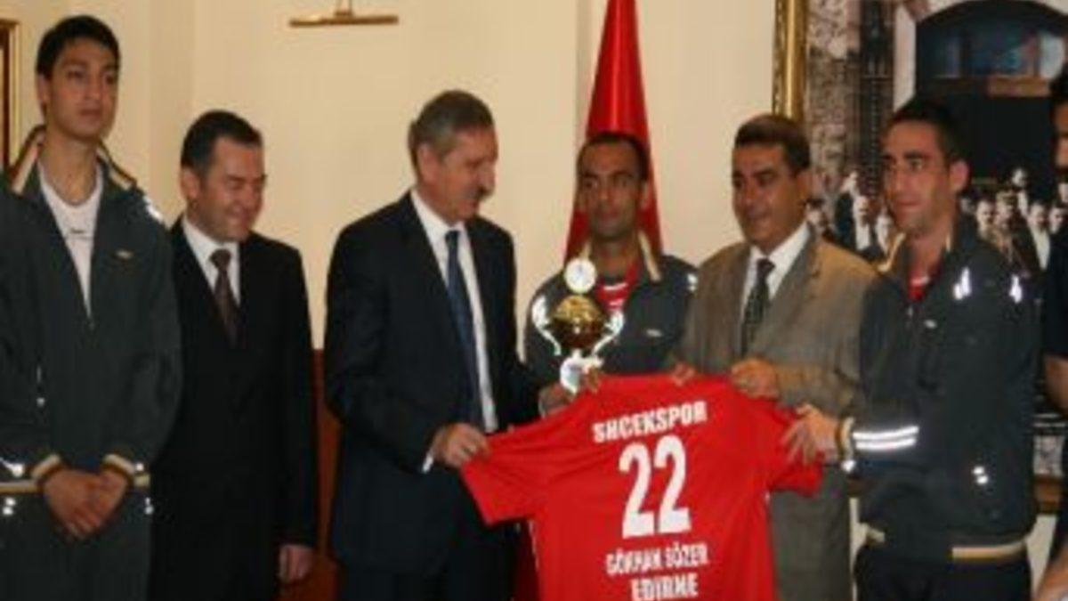SHÇEK Spor teknik ekibini ve futbolcularını makamında kabul eden Edirne Valisi Gökhan Sözer, futbolculara teknik heyete hediyeler verdi. Hayatta başarılı olmak için sosyal etkinliklerde de başarılı olmak gerektiğini ifade eden Vali Sözer, "Sosyal hizmetlerin futbolcuları, bizim futbolcularımız. Çocuklarımızın gösterdiği başarıdan büyük memnuniyet duyduk. Sadece okula gitmek ders çalışmak insanları hayatta başarılı kılmaz. Sosyal hizmetler, değer verdiğimiz, ilgi gösterdiğimiz bir kurumdur. Oradaki çocukların mutlu ve huzurlu ortamda yaşamasını arzu ederiz. Sizi futbolda gösterdiğiniz bu başarıdan dolayı tebrik ediyorum. Bu başarıyı sürdürmenizi temenni ediyorum" dedi.