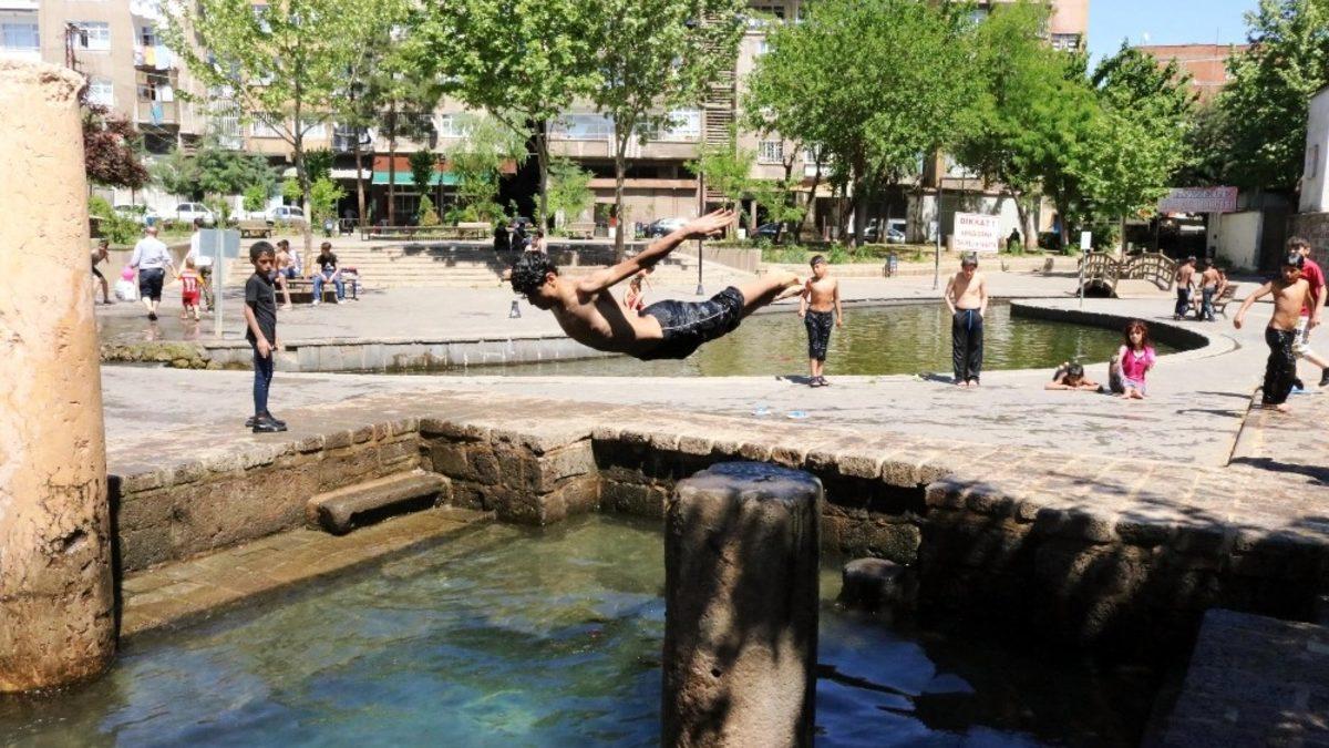 Sıcaklığın baş göstermesiyle kentteki tarihi Sur ilçesinde yer alan Anzele Parkı’nda buluşan çocuklar, içerisindeki taşlara aldırış etmeden havuza atlıyor. Çocuklar suya girdikten sonra beton zemine uzanıp, güneşlenirken, çevredeki vatandaşlar da meraklı gözlerle onları izliyor.