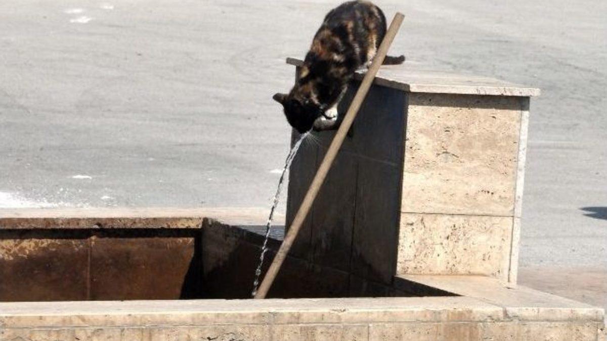 Bolu’da sıcak havadan bunalan bir kedi, çeşmenin tepesine çıkıp su içerek serinlemeye çalıştı.