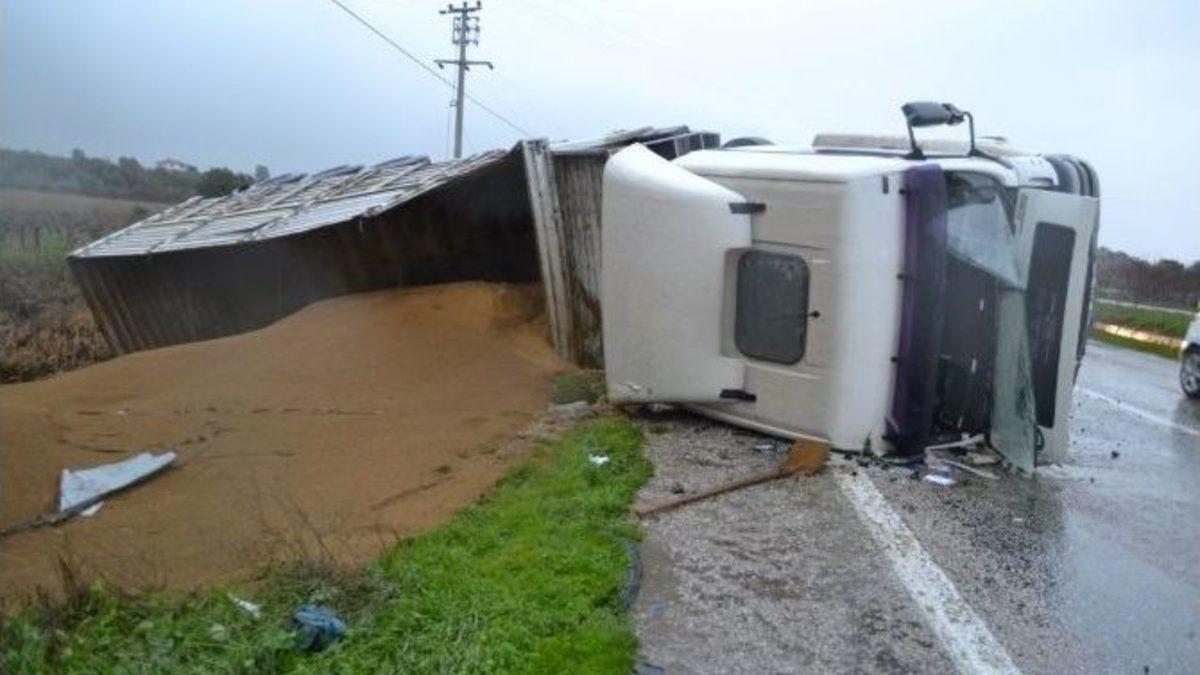 Manisa’nın Turgutlu ilçesi yakınlarında bir TIR, şiddetli fırtına ve sağanak yağış nedeniyle kayganlaşan yolda devrildi. TIR sürücüsü kazayı hafif sıyrıkla atlatırken ambulansla Turgutlu Devlet Hastanesine kaldırıldı.Manisa’dan Turgutlu istikametine giden Nurullah Kozak(47) yönetimindeki 35 MTK 04 plakalı kum yüklü TIR, Nif Çayı yakınlarında şiddetli fırtına ve sağanak yağış nedeniyle sürücüsünün direksiyon hakimiyetini kaybetmesi sonucu şarampole devrildi. Yaşanan kazada yaralanan Kozak, 112 acil servis ekiplerince Turgutlu Devlet Hastanesine kaldırıldı. TIR’da yüklü kum tarlaya dağılırken, emniyet güçleri kazayla ilgili soruşturma başlattı.