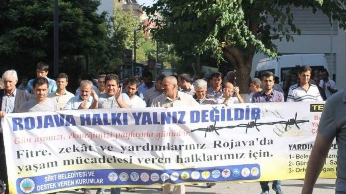 Siirt Belediyesi'nin öncülüğünde sivil toplum kuruluşlarının temsilcilerinin de desteğiyle Suriye’deki Kürtlere yardım kampanyası başlatıldı.Siirt Belediyesi önünde toplanan bir grup, Suriye'deki Kürtler lehine slogan atarak Güres Caddesi Sancaklar Okulu önüne kadar geldi. Pankart açan grup burada açıklama yaptı. Ramazan ayında fitre ve zekatların Suriye’deki Kürt halkına gönderilmesi çağrısında bulunan Siirt Belediye Başkan Yardımcısı Şakir Demir, Suriye'nin, yaşayan halkların onuru olduğunu, baskı ve tehdit altında kalan Kürt bölgesindekilere sahip çıkmak için yardımlaşma ve dayanışma kampanyası başlattıklarını söyledi.Cephedeki savaşın ancak insanlık onuru için yapılabileceğini belirten Demir, IŞİD karşısında kendini koruyan Kürt halkına 4 aylık bir yardım kampanyası başlattıklarını söyledi. Demir, "Siirt Belediyesi olarak başlattığımız çalışmaya diğer STK’lar da destek verecek. Ayrıca yardım kampanyasının ağını genişletmek için tüm halkı içine katacak şekilde kampanya yürütülecek. Ayni yardım toplama olmak üzere nohut, şeker, pirinç, yağ gibi 500 ton kuru gıda yardım almayı hedefliyoruz. Güres Caddesi, belediye hizmet binası önü ve Barış Mahallesi'ndeki parkta olmak üzere 3 ayrı yardım çadırını kurduk. Kurtalan ve Eruh başta olmak üzere diğer ilçelerde de kampanya başlatılacak. Toplanan yardımlar buradan Şanlıurfa’nın Suruç İlçe Belediyesi'ne gönderilerek, Suruç Belediyesi ve Türk Kızılayı aracılığıyla gönderilecektir" dedi.