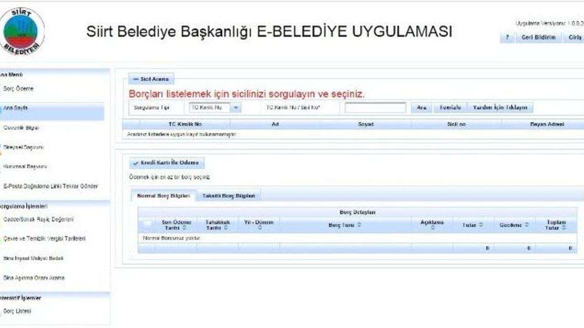 Siirt Belediyesi ’Akıllı kent’ projesi kapsamında e-belediyecilik uygulamasına geçti.Siirt Belediyesi ’Akıllı kent’ projesi kapsamında resmi internet sitesi www.siirt.bel.tr üzerinden e-belediyecilik sistemini hizmete geçirdi. Yeni sistemle belediyenin internet adresinden kredi kartı ile su faturası ödemenin yanı sıra, su borcu sorgulaması, bireysel başvuru, kurumsal başvuru, cadde ve sokak rayiç bedeli, çevre ve temizlik vergisi, bina inşaat maliyet bedeli, bina aşınma oranı ve belediyeye olan tüm borçların sorgulama hizmetlerinden faydalanabilecek.