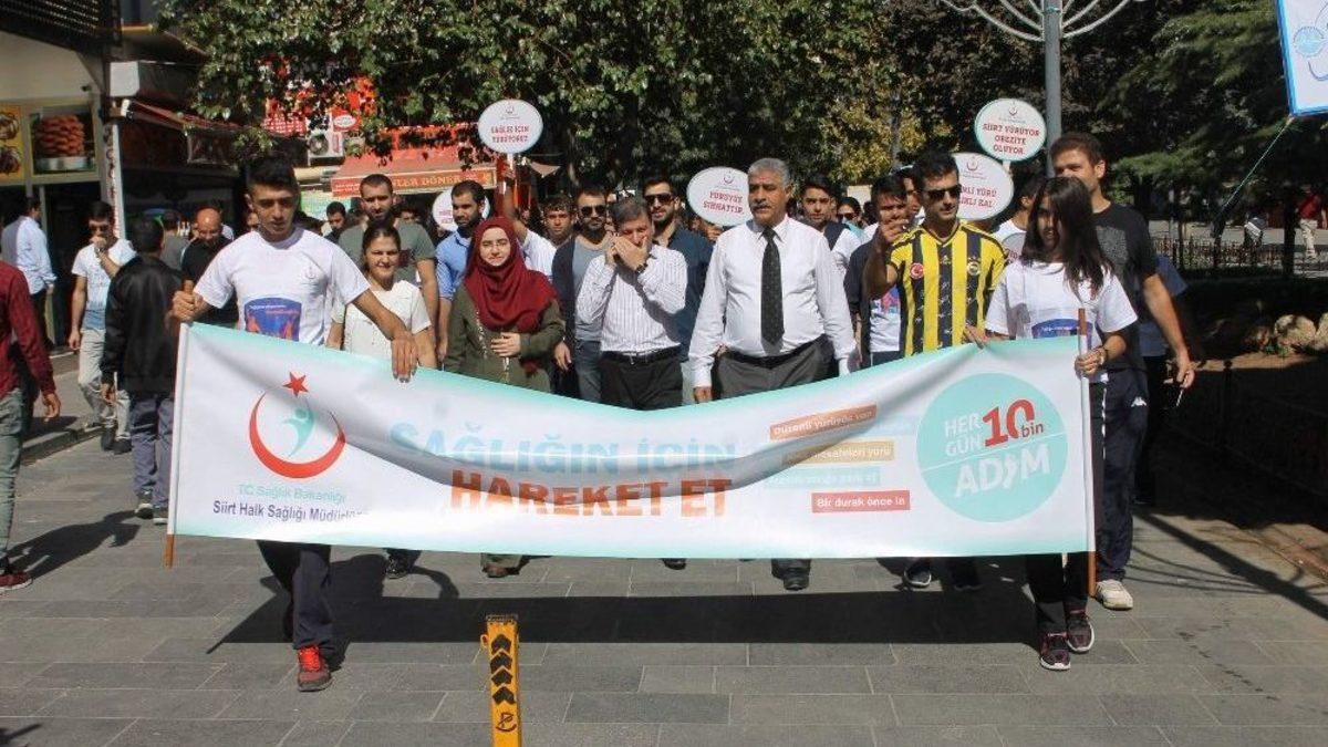 Siirt Halk Sağlığı Müdürlüğü, 3-4 Ekim Dünya Yürüyüş Günü’nde obeziteye dikkat çekmek için yürüyüş düzenledi.Halk Sağlığı Müdürlüğü binası önünde başlayarak 15 Temmuz Şehitler Meydanı’ndan 2. Nolu Saha’da son bulan yürüyüşe, Siirt Halk Sağlığı Müdürlüğü personeli ve öğrenciler katıldı. Siirt Halk Sağlığı Müdür Yardımcısı Dr. Emel Çelik burada yaptığı açıklamada; Sağlık Bakanlığı tarafından 1991 yılında bu yana ‘3-4 Ekim Dünya Yürüyüş Günü’ kapsamında sağlıklı yaşamın teşviki, obezitenin önlenmesi ve fiziksel aktivitenin desteklenmesi amacıyla çeşitli etkinlikler tertiplendiğini aktardı. Çelik, "Toplumun büyük bir çoğunluğunda fiziksel aktivite, günlük yaşam içinde kas ve eklemlerin kullanılarak enerji harcaması ile gerçekleşen, kalp ve solunum hızını arttıran ve farklı şiddetlerde yorgunlukla sonuçlanan aktiviteler olarak tanımlanmaktadır. Bu kapsamda spor aktivitelerinin yanı sıra egzersiz, oyun ve gün içinde yapılan çeşitli aktiviteler de fiziksel aktivite olarak kabul edilmektedir. Fiziksel aktivitenin sağlık için öneminin yeterince anlaşılmaması ve giderek daha hareketsiz bir yaşam tarzının benimsenmesi, toplumda obezite, kalp-damar hastalıkları, hipertansiyon, diyabet, osteoporoz gibi kronik hastalıkların görülme sıklığını arttıran önemli nedenlerden biri olmuştur. Yapılan araştırmalara göre özellikle kolon kanserinin yüzde 27’si diyabetin yüzde 25’i kalp hastalıklarının ise yüzde 30’unun fiziksel aktivite yetersizliğinden kaynaklandığı ortaya çıkmıştır" dedi.Çelik, kronik hastalıklarla mücadele için en günde en az 10 bin adım atılması çağrısında bulundu. Halk Sağlığı Şube Müdürü İbrahim Teğin, yetişkinlerin haftanın 5 günü en az 30 dakika, 5 ile 17 yaş gurubu ise 60 dakika da fiziksel aktivite yapması gerektiğini söyledi.