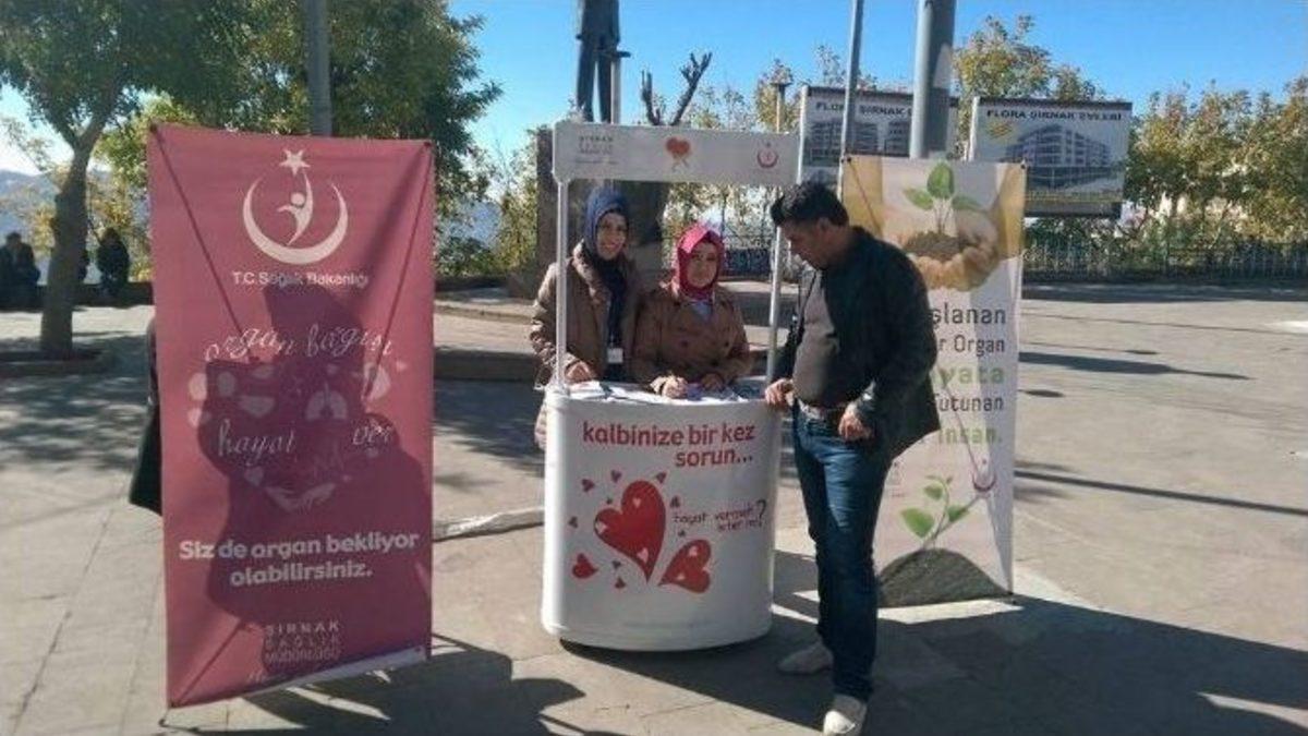 Şırnak’ta, 3-9 Kasım Organ Bağış Haftası dolayısıyla açılan stantta vatandaşlar bilgilendirildi.Şırnak Cumhuriyet Meydanı’nda açılan stantta görevli olan hemşire Berrin Yılmaz, organ bağışı ve nakli konusunda halkı daha duyarlı olmaya davet ettiklerini söyledi. Organ bağışında bulunan kişinin organlarının hangi durumlarda ve nasıl alınacağı 1979 yılında yürürlüğe giren 2238 sayılı Organ ve Doku Alınması, Saklanması ve Nakli Hakkındaki Kanun’da açıkça belirtildiğini anlatan Yılmaz, "Bu yasaya göre 18 yaşından büyük ve akli dengesi yerinde olan herkes organlarının tamamını veya bir bölümünü bağışlayabilir. Organ bağışının dini yönden hiçbir sakıncası yoktur. Tüm büyük dinler organ bağışını onaylamakta ve desteklemektedir. Kur’an-ı Kerim’de "Kim bir insana hayat verirse onun tüm insanlara hayat vermişçesine sevap kazanacağı" beyan olunmaktadır. Diyanet İşleri Başkanlığı Din İşleri Yüksek Kurulu da organ naklinin caiz olduğunu açıklamıştır. Organ bağışı ile geleceğe umut olun. Yapılan araştırmalar sonucunda çıkan istatistiklere göre organ bağışının dünya sıralamasında Türkiye’in son sıralarda yer alması halkımızın bu konuda yeterli bilgiye sahip olmadığının göstergesidir. Bu stantları açmamızdaki asıl gayemiz halkımızı bilinçlendirme ve duyarlı olmaya davet etmektir. Türkiye’de organ bağışı ve nakli sayılarının yetersizliği son dönem organ yetmezliği nedeniyle tedavi görmekte olan birçok hastanın organ beklerken hayatını kaybetmesine neden olmaktadır. Hastaların yaşam süresi ve kalitesinde, ülke ekonomisi ve iş gücünde ağır kayıplara yol açan söz konusu organ yetmezlikleri önemli bir sorun olarak gündemdeki yerini korumakta olup, organ bağışı ve nakli sayılarının artırılması hedeflenmektedir" dedi.