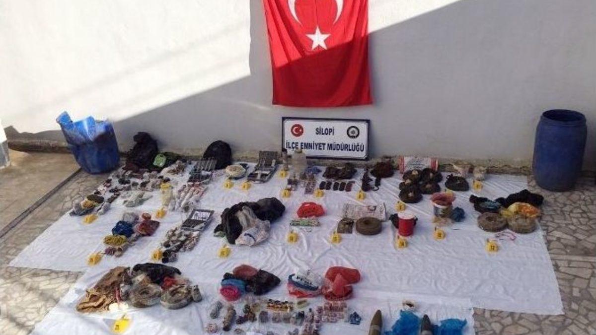 Şırnak’ın Silopi ilçesinde terör örgütüne ait çok sayıda mühimmat ele geçirildi.Silopi ilçesinde güvenlik güçleri, terör örgütü mensupları tarafından araziye gömüldüğü değerlendiren çok sayıda mühimmat ele geçirdi. Şırnak Valiliği tarafından yapılan açıklamada, Silopi ilçesi kırsalında alınan istihbarat neticesinde 6 Ocak’ta terör örgütüne ait araziye gömülü olduğu değerlendiren çok sayıda mühimmatın ele geçirildiği belirtildi. Çalışmaların kararlılıkla sürdürüldüğü belirtilen açıklamada, 5 anti tank mühimmatı, 6 tnt maddesi, 1 el yapımı patlayıcı, 11 roket başlıklı el yapımı patlayıcı, 1 kaleşnikof silah, 6 şarjör, 1 termal dürbün ve çok sayıda patlayıcı düzeneği ve ateşleme elektronik devrelerin ele geçirildiği bildirildi.