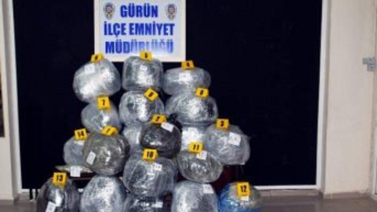 Sivas’ın Gürün ilçesinde polis tarafından şüphe üzerine takibe alınıp durdurulan otomobillerde 101 kilo esrar ele geçirildi.Gürün İlçe Emniyet Müdürlüğü ekipleri, yol kontrol, arama ve tarama faaliyetleri sırasında Kayseri istikametine gitmekte olan bir aracı şüphe üzerine takibe aldı. Takip sırasında aracın başka bir araca öncülük ettiği ve devamlı haberleştikleri tespit edildi. Bir saatlik takibin ardından araçlar durdurularak arama yapıldı.Diyarbakır’dan getirildiği tespit edilen 101 kilo kubar esrar ele geçirilirken, araçlarda bulunan N.K., M.G., Ş.A., S.G. ve M.K. isimli şahıslar gözaltına alındı. Gürün İlçe Emniyet Müdürlüğüne getirilen şahıslar, ilk ifadelerinin ardından Gürün Cumhuriyet Başsavcılığına sevk edildi. İşlemleri tamamlanan 3 şahıs tutuklanıp Gürün Kapalı Cezaevi'ne gönderilirken, gözaltına alınan diğer 2 kişinin sorguları devam ediyor.