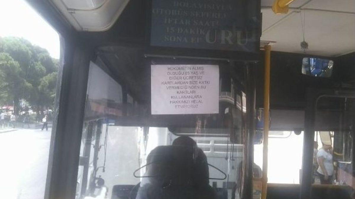 Isparta'da Özel Halk Otobüsleri'nde görevli otobüs şoförü A.Y., 65 yaş ve üzeri ile diğer ücretsiz kartlardan otobüs şoförlerine katkı verilmemesine tepki göstererek otobüsün camına, "Hükümet, almış olduğu 65 yaş ve diğer ücretsiz kartlardan bize katkı vermediğinden bu kartları kullananlara hakkımızı helal etmiyoruz" yazılı kağıdı astı. Yolculardan gelen tepki ve yapılan şikayetler üzerine çalışma başlatan Özel Halk Otobüsleri Kooperatifi Başkanı Mehmet Yavuz, sürücünün işine son verdiğini açıkladı.Yavuz, yaptığı açıklamada, söz konusu yazıyı, sürücünün kendisinin astığını, kooperatifin yazıdan bilgisinin olmadığını kaydetti. Bu duruma çok sinirlendiğini ve yapılanın kabul edilemez olduğunu söyleyen Yavuz, serbest binişlerin sadece Isparta'da değil, tüm Türkiye'nin sorunu haline geldiğini, bu soruna bir an önce çözüm bulunması gerektiğini iletti.