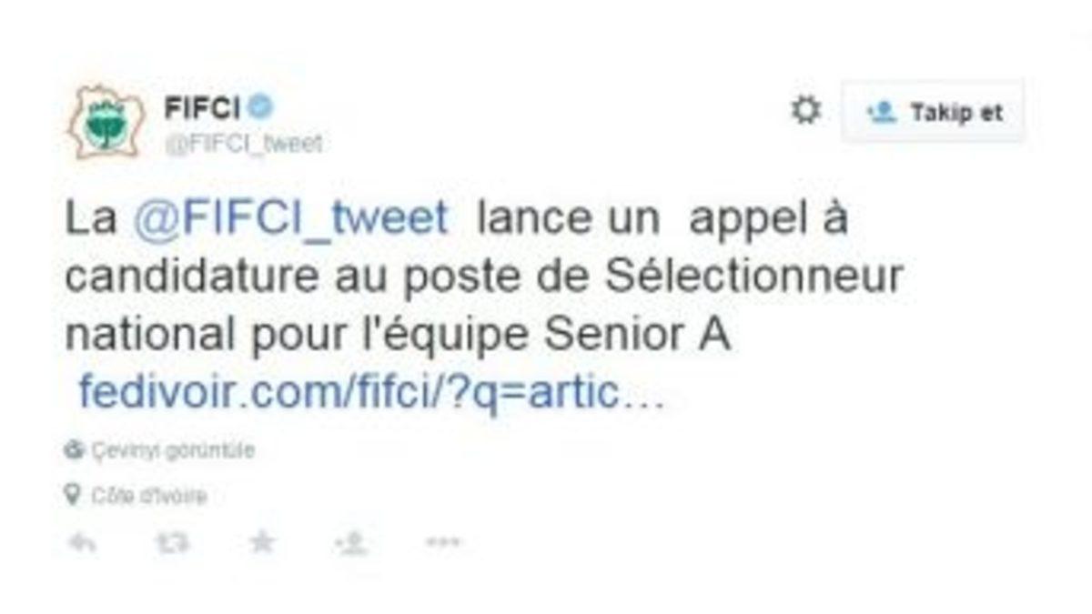 Fildişi Sahili Milli Takımı, yeni teknik direktörünü sosyal medya üzerinden yayınladığı iş ilanı ile arıyor.Fildişi Sahili Futbol Federasyonu, Herve Renard’dan boşalan teknik direktörlük koltuğuna aradığı yeni ismi sosyal medya üzerinden bulmaya çalışıyor. Federasyonun resmi Twitter hesabında paylaşılan iş ilanında, yeni teknik direktör için adaylık başvurusunda bulunacak kişilerden bazı şartlar istendi. Buna göre, yeni teknik direktörde üst düzey antrenörlük, uluslararası tecrübe, Fransızca konuşma, Fildişi Sahilleri’nde ikamet, ekip çalışmasına yatkınlık, üst düzey antrenörlük diploması gibi şartlar aranıyor. Başvurmak isteyen adayların ilgili belgeleri, CV’sini ve motivasyon mektubunu 14 Temmuz tarihine kadar federasyona göndermeleri isteniyor.