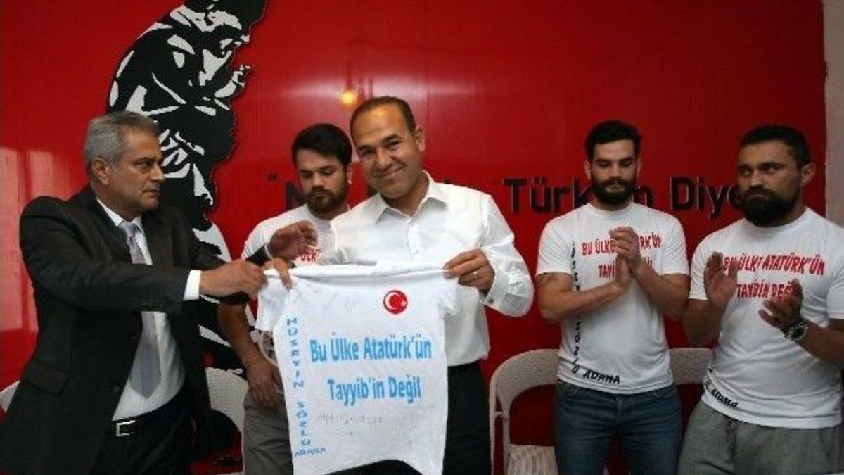Milliyetçi Hareket Partisi (MHP) Adana Büyükşehir Belediye Başkan Adayı Hüseyin Sözlü, Dünya Profesyonel Orta Boks Liginde Türkiye'yi temsil eden ve çeyrek finalden yarı finale yükselen Buğra Öner, Alptuğ Öner ve Ünsal Arık'ı seçim bürosunda kabul ederek kutladı.Adana Avcılar Boks Kulübü Başkanı Murat Öner ve Adana Ülkü Ocakları İl Başkanı Mehmet Ali Arslan'ın da bulunduğu ziyarette, boksörler Başkan Sözlü'ye ringde giydikleri boks eldivenlerini giydirdiler. Tekirdağ'da yapılan karşılaşmalara üzerlerinde "Bu ülke Tayyibin değil Atatürk'ündür" yazılı tişörtleri ile çıkarak gündem oluşturan Buğra Öner, Alptuğ Öner ve Ünsal Arık, bir üst tura geçmelerinde kendilerine maddi ve manevi destek veren Sözlü'ye tişörtlerini vererek teşekkür ettiler.Boks eldivenini giyerek basın mensuplarına görüntü veren Sözlü, bir soru üzerine "Benim Adana'da rakibim yok" dedi. Adana Avcılar Boks Kulübü Başkanı Murat Öner ve boksörlerin konuşmalarından sonra Sözlü, başta bu boksörler olmak üzere amatör ve profesyonel sporculara bugüne kadar olduğu gibi bundan sonra da desteklerinin devam edeceğini ifade etti. Sözlü, kendisine hediye edilen tişörtü, Adana Ülkü Ocakları İl Başkanı Mehmet Ali Arslan'a vererek, Ocak binasının en güzel yerinde asmalarını istedi.