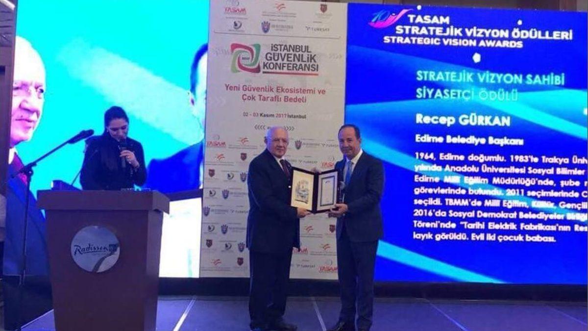 Türk Asya Stratejik Araştırmalar Merkezi (TASAM) tarafından verilen 10. Stratejik Vizyon Ödülleri’nde Edirne Belediye Başkanı Recep Gürkan Stratejik Vizyon Sahibi Siyasetçi Ödülü’nün sahibi oldu.Türk Asya Stratejik Araştırmalar Merkezi (TASAM), Milli Savunma ve Güvenlik Enstitüsü (MSGE) ile Nişantaşı Üniversitesinin düzenlediği 3. İstanbul Güvenlik konferansının gala yemeği ve ödül töreni İstanbul’da bir otelde gerçekleştirildi.Edirne Belediye Başkanı Recep Gürkan’ın da katıldığı, sekiz kategoride düzenlenen ödül töreninde yurt içi ve yurt dışındaki isimler ödüle layık görüldü. Törende Edirne Belediye Başkanı Recep Gürkan, Stratejik Vizyon Sahibi Ödülü’nün sahibi oldu.