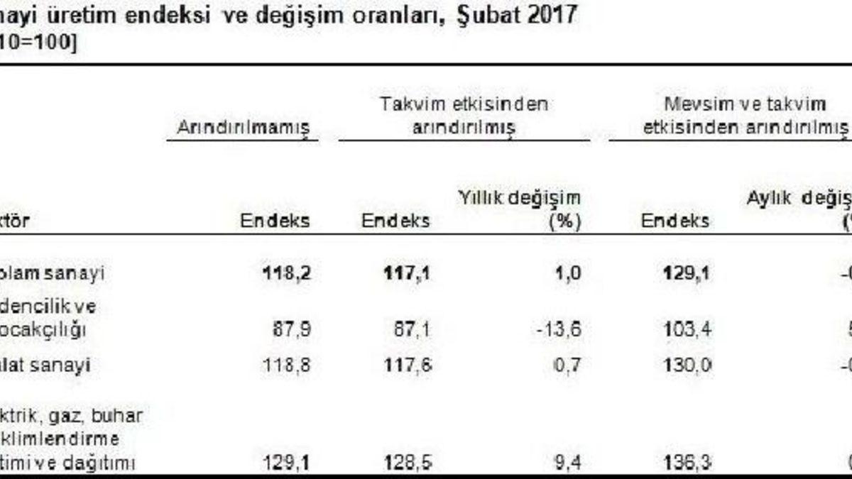 Takvim etkisinden arındırılmış sanayinin alt sektörlerinde 2017 yılı Şubat ayında madencilik ve taşocakçılığı sektörü endeksi bir önceki yılın aynı ayına göre yüzde 13.6 azaldı. İmalat sanayi sektörü endeksi yüzde 0.7 ve elektrik, gaz, buhar ve iklimlendirme üretimi ve dağıtımı sektörü endeksi yüzde 9.4 arttı.