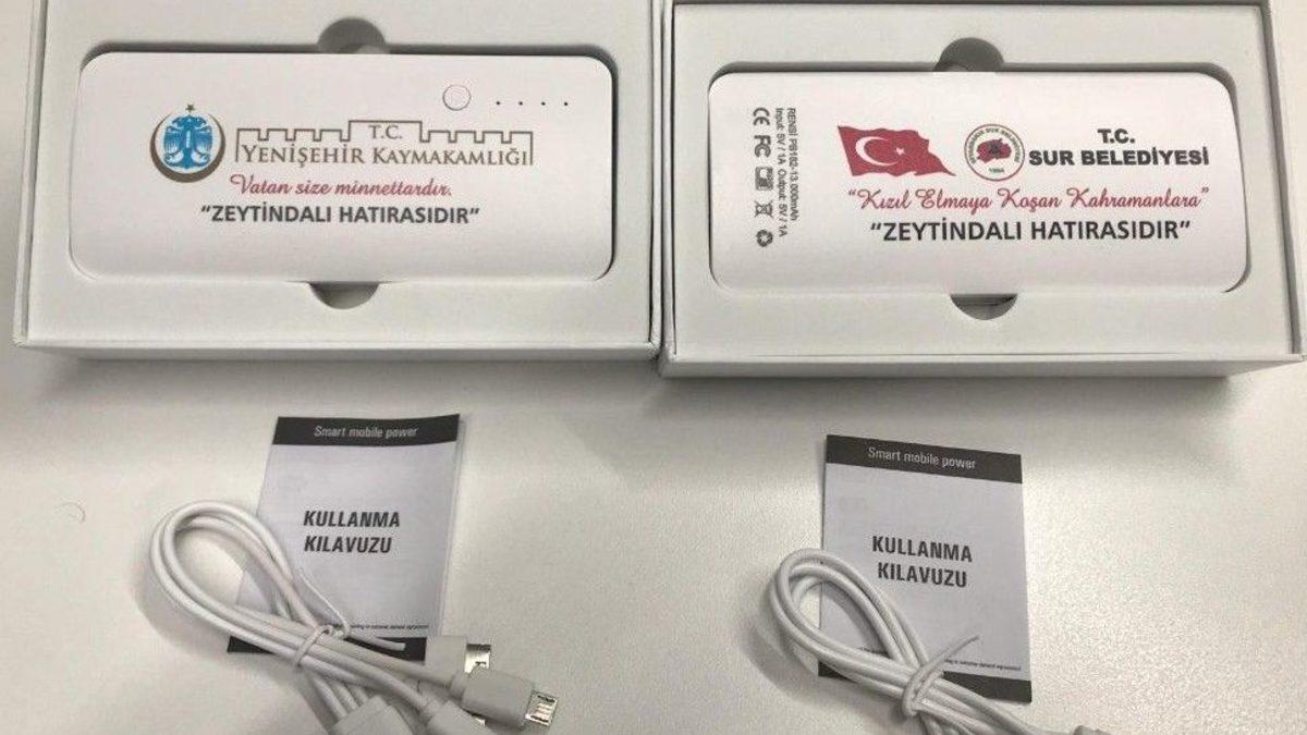 Diyarbakır’ın Sur ve Yenişehir belediyeleri, Zeytin Dalı Harekatı’nda görevli güvenlik güçlerine üzerlerinde “Zeytindalı hatırası” ve “Vatan size minnettardır” yazıları bastırılan powerbank gönderdi.Diyarbakır Sur İlçe Kaymakamı ve Belediye Başkanı Bilal Özkan ile Yenişehir İlçe Kaymamı ve Belediye Başkanı Serdar Kartal’dan, Türk Silahlı Kuvvetlerince (TSK), Suriye’nin kuzeybatısındaki Afrin bölgesinde terör örgütlerine yönelik sürdürülen Zeytin Dalı Harekatı’na destek geldi. Belediyeler, harekatta görevli güvenlik güçlerine powerbank gönderdi.Sur Belediyesince gönderilen powerbankların üzerinde “Kızıl Elmaya Koşan Kahramanlara Zeytindalı hatırasıdır”, Yenişehir Belediyesince gönderilenlerin üzerine ise “Vatan size minnettardır, Zeytindalı hatırası” yazıldı.