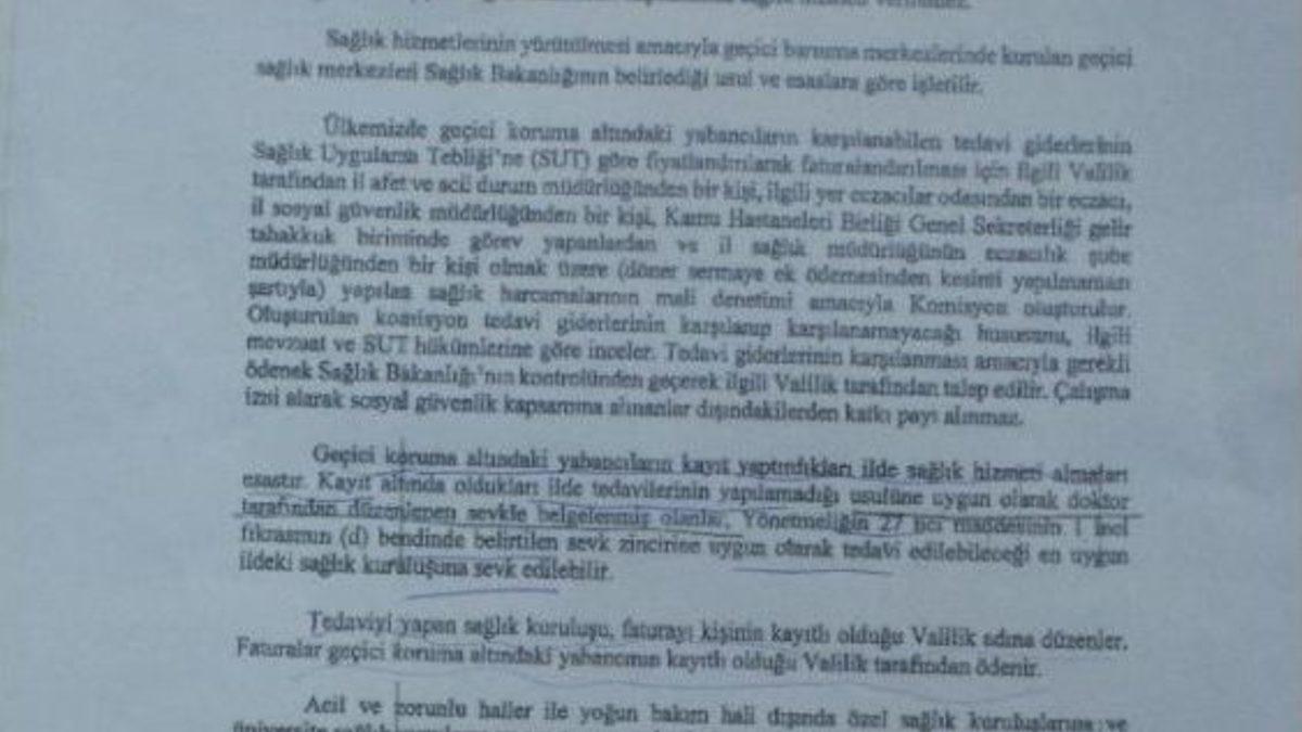 Başbakanlık Afet ve Acil Durum Yönetimi Başkanlığı( AFAD) tarafından Valilikler aracılığıyla kamu hastanelerine gönderilen genelgede. Geçici koruma altındaki yabancıların kayıt yaptırdıkları ilde sağlık hizmeti almalarının esas olduğu hatırlatıldı. Genelgede, "Kayıt oldukları ilde tedavilerin yapılamadığı halde, usulüne uygun olarak doktor tarafından düzenlenen sevkle belgelenmiş olanlar, Yönetmenliğin 27'nci maddesinin 1.nci fıkrasının (d) bendinde belirtilen sevk zincirine uygun olarak tedavi edilebileceği en uygun ildeki sağlık kuruluşlarına sevk edilebilir. Tedavi yapan sağlık kuruluşları, faturayı kişinin kayıtlı olduğu Valilik adına düzenler. Faturalar geçici koruma altındaki yabancının kayıtlı olduğu Valilik tarafından ödenir" diyor.