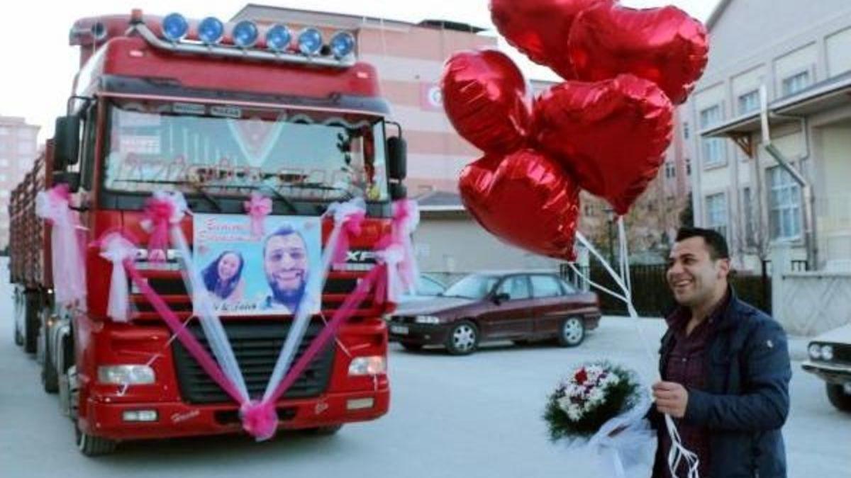 Mesut MADAN/BURDUR, Burdur Küçük Sanayi Sitesi'nde sigorta ekspertizi Fatih Akgül, bir fabrikada idari personel olarak çalışan nişanlısı Hale Aygün'e 14 Şubat Sevgililer Günü'nde evlilik teklifi yapmaya karar verdi. Sürpriz teklif için arkadaşlarından yardım isteyen Fatih Akgül, arkadaşına ait TIR'ı süsleyip bu sabah erken saatte nişanlısının Bozkurt Mahallesi TOKİ konutlarındaki evinin önüne geldi.