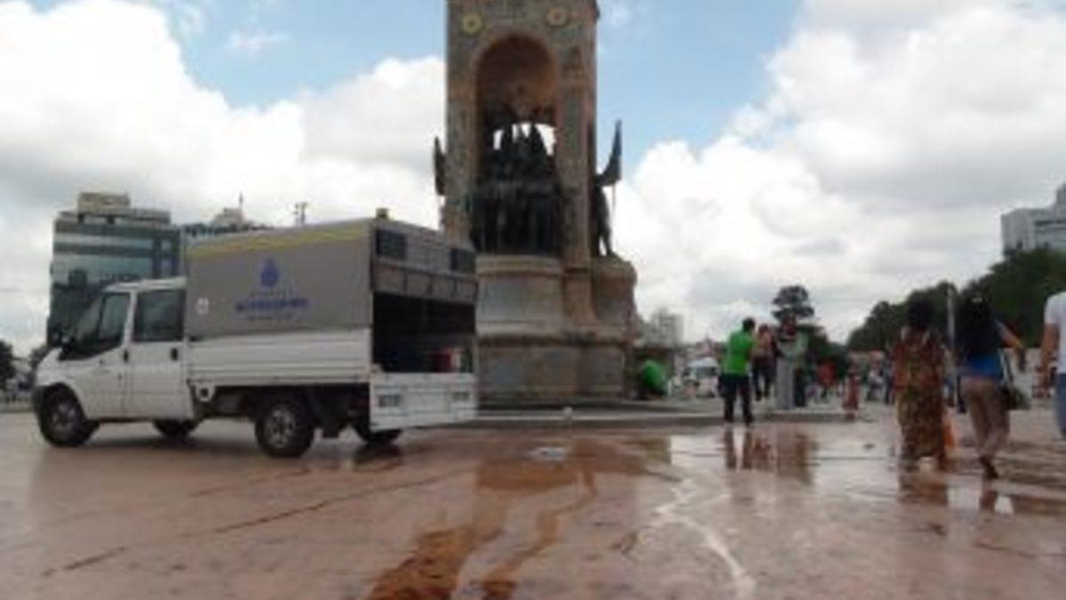 Taksim Meydanı’na gelen İstanbul Büyükşehir Belediyesi ekipleri, anıt üzerindeki boyaları temizlemeye başladı. Anıtın hasar gören tarafları da ekipler tarafından tamir edildi. Ayrıca yerlerdeki yazılar da özel maddelerle temizlendi.