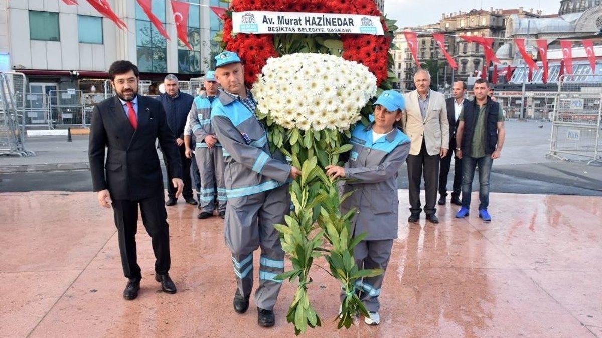 Beşiktaş Belediye Başkanı Murat Hazinedar, 1 Mayıs nedeniyle Taksim Meydanı’na temizlik işçileri ile birlikte çelenk bıraktı.Taksim Meydanı’na sadece anma için çelenk bırakılmasına izin verilirken meydana gelen ilk isim Beşiktaş Belediye Başkanı Murat Hazinedar oldu. Başkan Hazinedar temizlik işçileriyle birlikte sabahın erken saatlerinde Taksim Meydanı’na geldi. Ardından işçilerle birlikte Taksim Cumhuriyet Anıtı’na çelen bırakan Başkan Hazinedar tüm işçilerim bayramını kutladı. İşçiler ile birlikte Kazancı yokuşuna yönelen Hazinedar, 1977’yılında 1 Mayıs kutlamalarında hayatını kaybeden 77 vatandaş için yokuşa karanfil bırakarak, dua etti.Anmaların ardından işçilere de karanfil dağıtan Başkan Hazinedar, emeğin karşılığının en yüksek seviyede Beşiktaş’ta karşılık bulduğunu söyleyerek, “1 Mayıs emeğin bayramı ama Türkiye’de emekçilerin, emeğin karşılığının hiç şüphesiz en yüksek seviyede karşılık bulduğu yer Beşiktaş biz Türkiye’de bu sabah itibari ile bütün 2 bin 200 işçi kardeşimizin tamamı sendikal örgütlenmenin çatısı altına girmiş ve toplu sözleşmesini imzalamış olacak. Biz geldiğimizde bir söz vermiştik. Beşiktaş özgürlükçü demokrasinin kalbi, çağdaş değerlerin en güzel yaşadığı yer. Biz işçi kardeşlerimizle emekçi kardeşlerimizle büyük bir aşk yaşıyoruz Beşiktaş’ta. Onlarla birlikte her attığımız adımı paylaşarak birlikte karar vererek gerçekleştirtiyoruz. Tabi 1 Mayıs Taksim’de 4 sene önce ilk kez işçi kardeşlerimizle beraber çıkıyor ve 1977’de başta olmak üzere emeğe saygımızı ve anmamızı gerçekleştiriyor. Gönlümüz ister ki nasıl darbe girişiminde hemen sonra burada 24 Temmuz’da Taksim açılarak Türkiye’de demokrasiye inananlar büyük bir haykırışı ifade etme imkanı bulduysa Taksim’de her zaman olarak. Bu devleti yönetenlerin inisiyatifine bağlı olmamalı. Ama tabi ki devlet önlem almalı. 1 Mayıs emeğin, emekçinin bayramı kutlu olsun” dedi.