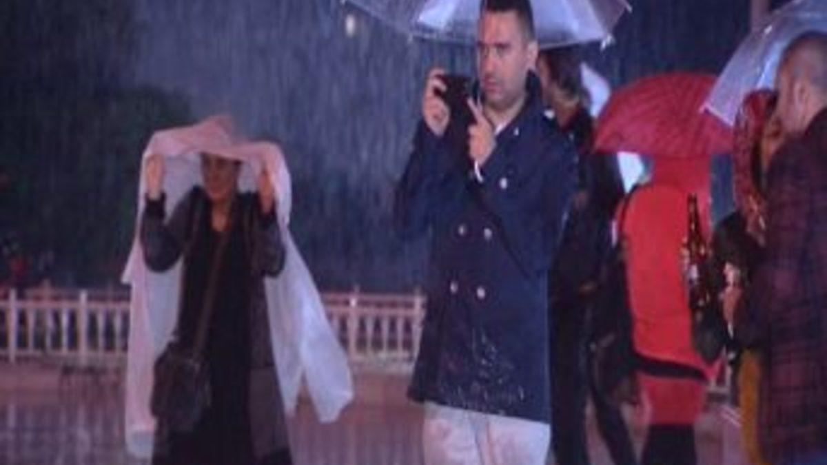 Günlerdir Taksim Meydanı ve Gezi Parkı'nda eylem yapan göstericiler, ani bastıran yağmur nedeniyle zor anlar yaşadı. Gece saatlerinde başlayan ve etkisini iyice artıran yağmur nedeniyle eylemciler, koşuşturarak saçak altlarına sığındı. Eylemcilerden bazılarının da yağan yağmura aldırış etmedikleri görüldü. Bazı eylemcilerin ise şemsiyeler ve yağmurluklar kullanarak Taksim Anıtı etrafında toplandıkları görüldü.