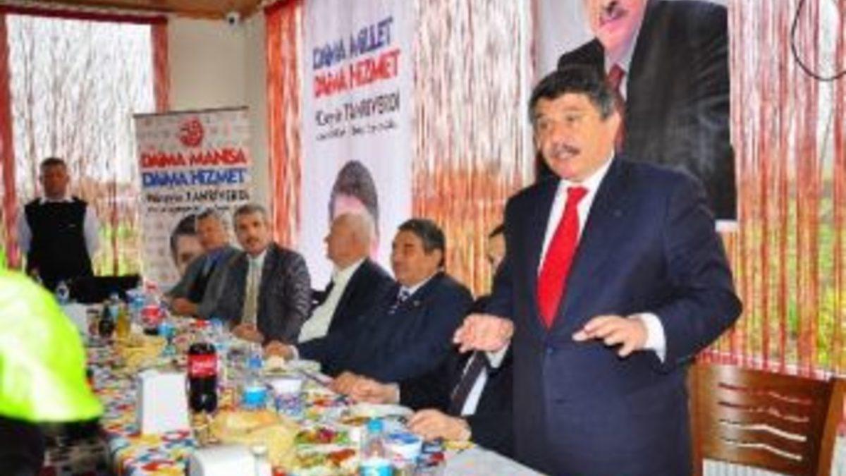 AK Parti Manisa Büyükşehir Belediye Başkan Adayı Hüseyin Tanrıverdi, Soma’da köy ve mahalle muhtarları ile yemekte bir araya geldi.Park Sardunya’da gerçekleşen toplantıya Tanrıverdi’nin yanısıra AK Parti Manisa Milletvekili ve Plan Bütçe Komisyon Başkanı Recai Berber, AK Parti İl Başkanı Murat Baybatur, Soma Belediye Başkan Adayı Hasan Ergene, İlçe Teşkilat Başkanı Mehmet Ali Özkan, İl Gençlik Kolları Başkanı Halil Özkan, partililer ve muhtarlar katıldı. Manisa’yı Büyükşehir yapmakla bir tarih yazdıklarını belirten Tanrıverdi, “İnşallah hizmetlerimizle de bir destan yazacağız. Bunları birlikte gerçekleştireceğiz. Şehir merkezinde mahalleler, kırsalda köyler ve beldelerde muhteşem hizmetleri nasıl beraber yaptıysak bundan sonra da büyük hizmetlere devam edeceğiz.” dedi. Muhtarlarla her görüşmelerinde maaşlarına zam yapılması yönünde istekleri olduğunu hatırlatan Tanrıverdi, konuşmasının devamında “Biz de kendilerine maaşlarınız iyi noktaya gelecek diyorduk, bazıları inanmıyor bazıları da çok yakında olacak diyordu. Gerekli takiplerimiz sonucu muhtar maaşları 871 lira oldu. 2002 Ak Parti iktidarından önce muhtarlarımız 90 lira alıyordu. Bağkur primini ödeyemiyor, sosyal güvenliğini yaptıramıyordu, perişan durumdaydı, şimdi hepsini yapıyorlar ceplerine de para kalıyor.” ifadelerini kullandı."EN AZ YÜZDE 70"Son seçimlerinde Soma’dan %53 oy aldıklarını hatırlatan Tanrıverdi, “Bunu en az %10-15 artırmamız lazım. En az %70 olması lazım. Bu çıtaya ulaştığımızda da gülen yüz, Soma’nın, Manisa’nın, Türkiye’nin ve dünya mazlum insanlarının yüzü olsun. Bunu yaparsak son zamanlarda oynanan kirli oyunları bozmuş olacaksınız.” dedi.TANRIVERDİ’DEN SİYAH İNCİLER’E DESTEKPark Sardunya’daki muhtarlar toplantısı sırasında alana gelen Somaspor’un taraftar grubu Siyah İnciler, ‘Büyük Başkan Tanrıverdi’ sloganları attı. Toplantı sonunda taraftarlar Tanrıverdi ile görüşerek hafta sonu Manisa’da oynanacak olan Manisa Belediyespor-Somaspor maçına davet etti. Tanrıverdi ise taraftarları kırmayarak karşılaşmayı izlemek için orada olacağını belirtti.