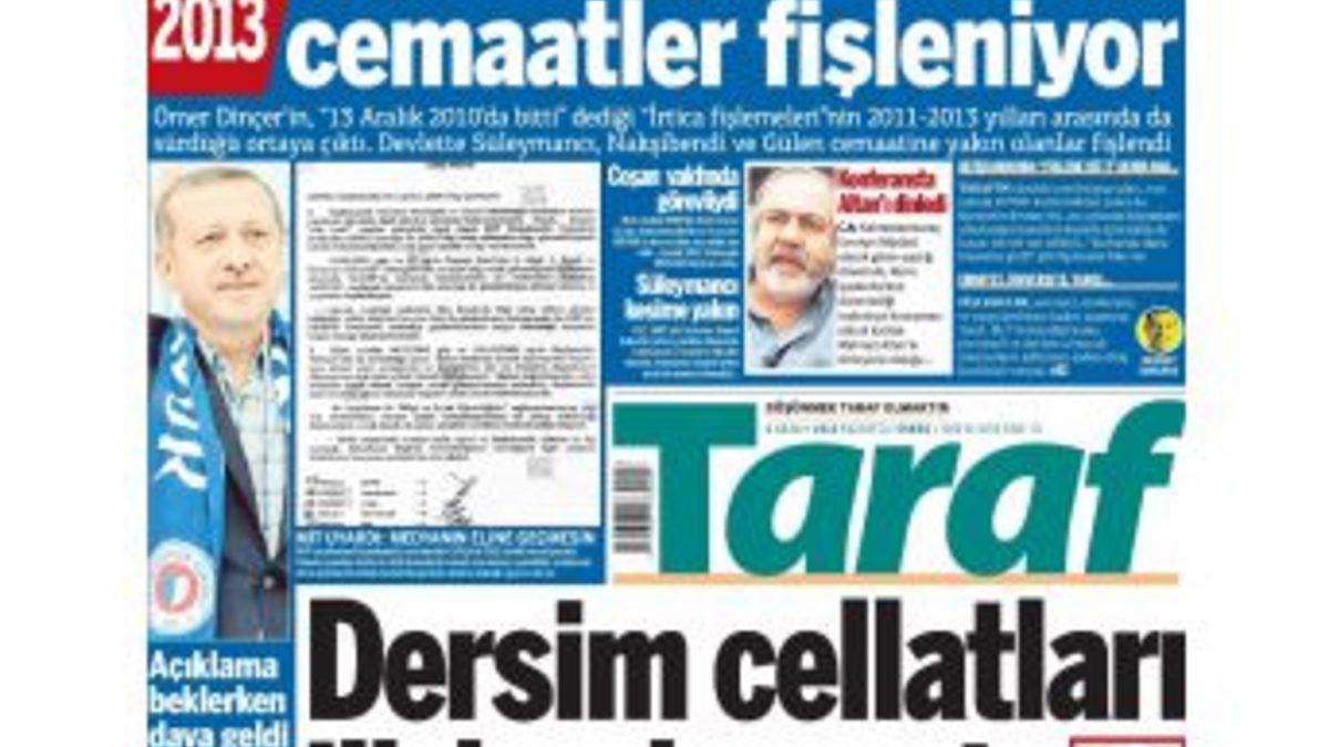 Fethullah Gülen’i Bitirme Eylem Planı’nın hükümet tarafından imzalandığını ortaya koyan belgeler kamuoyunda tartışılmaya devam ediyor. Belgeyi gündeme getiren Taraf gazetesinin bugünkü manşetinde MGK’da ortaya konulan eylem planı çerçevesinde diğer cemaatlerin de fişlendiği iddiaları yer aldı. Birinci sayfasında manşet üstünde ‘Yıl 2013: Hükümete ters düşen cemaatler fişleniyor’ başlığı ile verilen haberde, söz konusu dönemde Başbakanlık Müsteşarlığı yapan eski Milli Eğitim Bakanı Ömer Dinçer’in, “13 Aralık 2010’da bitti.” dediği ‘İrtica fişlemeleri’nin 2011-2013 yılları arasında da sürdüğü dile getirildi. Haberde bununla ilgili belgelere yer verildi, devlette veya özel sektörde üst kademelerde yer alan isimlerin ‘Süleymancı’, ‘Nakşibendi’ ve ‘Gülen cemaatine yakın’ diye fişlendiği ifade edildi. Taraf gazetesinin yayımladığı belgelerle ilgili hükümet kanadından “Yok hükmündedir, gereği yapılmadı, hayata geçirilmedi.” açıklamaları yapıldı. Bu çerçevede adı gündeme gelen dönemin Başbakanlık Müsteşarı Ömer Dinçer de MGK kararlarını zaman içerisinde hayata geçirdiği iddialarına karşılık, kendisine bağlı Başbakanlık Uygulama Takip Koordinasyon Kurulu’nun 2010’da tarihe karıştığını ve tüm uygulamaların kaldırıldığını açıkladı. Taraf, bugün de konuyla ilgili yeni bilgi ve belgeler yayınladı. Kaldırılan kurulun yerine Başbakanlık’ta yeni bir birim oluşturulduğunu ve bu birimin iktidara ters düşen cemaatleri, özellikle de devlet kurumlarında çalışan ya da görev alacak olan Fethullah Gülen Cemaati’ne yakın kişileri fişlediğini öne sürdü. Devlette 30 yıldır görev yapan kişilerin bile atamalar öncesi fişlenip Başbakanlığa rapor edildiğini, hatta bu konuda gazeteci - yazar ve Ekonomi Profesörü Mehmet Altan’ın konferansına izleyici olarak katılan bir devlet memurunun bile fişlendiğini aktardı. MİT tarafından yapılan fişlemelerin Başbakanlığa resmî yazıyla gönderildiği, fişleme belgelerinin Başbakanlık Müsteşarı Efkan Ala tarafından toplanıp, gereğinin yapılması için klasörlere konulduğu iddiasına yer verilen haberde, “Resmî yazı ve fişleme belgelerine bakıldığında, 2004 MGK’sında alınan kararların, 2011, 2012, 2013 yılında da hayata geçirildiği görülüyor. MİT tarafından Başbakanlığa gönderilen resmî yazışmada, fişleme yapılan kişilerle ilgili belgelerin özenle korunması gerektiği, bunların medyanın eline geçmesi hâlinde değişik komplikasyonlara neden olacağı uyarısı da var.” ifadeleri kullanıldı. Taraf Gazetesi, MİT tarafından fişlenip Başbakanlığa gönderildiğini iddia ettiği kamuda görevli kişiler ile kamuya yeni alınacak kişilerin listelerini, isimlerinin baş harflerini vererek yayımladı. Gazetede yer alan bazı fişleme bilgileri şöyle: “Kaymakan Adayları 2013:DANA HİSSESİNE GİRDİ FİŞLENDİV.K: Aydın-Ayten oğlu, Mersin- 1986 doğumlu. V.K. hakkında; Aralık 2008 ayı (Kurban Bayramı)’nda, Mersin’de F. GÜLEN Cemaati tarafından, Moğolistan’da vekaleten kesilmek üzere “Kurban hissesi” gönderen şahıslar arasında yer aldığı...C. A: Kamal-Emine Hatay-1955, Kahramanmaraş İl Emniyet Müdürü olarak görev yaptığı dönemde F. GÜLEN Grubu Nurcu kesimin kontrolünde bulunan Kahramanmaraş Lider İşadamları Derneği (KALİDA), 21/11/2009 tarihinde Kahramanmaraş Ramada Otel’de “Dar Çerçeve” konu başlığıyla Star Gazetesi başyazarı Mehmet ALTAN’ın konuşmacı olarak katıldığı yemekli bir toplantıya dinleyici olarak katıldığı, Kayseri Emniyet Müdürü olarak görev yaptığı dönemde, Doğu Türkistan Kültür ve Dayanışma Derneği (DTKDD) tarafından, 18.08.2010 tarihinde Kayseri’deki dernek merkezinde Gönüllü Kültür Teşekküllerinin iştiraki ile düzenlenen iftar yemeğine katılanlar arasında yer aldığı... SÜLEYMANCI KESİMLE İLTİSAKLIO. Z: Hüseyin-Nimet Bekilli-1961. 1987 yılı itibarıyla Samsun Emniyet Müdürlüğü Siyasi Şube Dernekler Masasında görev yaptığı dönemde, Süleymancı kesim ile iltisaklı olduğu, İçişleri Bakanlığı Emniyet Genel Müdürlüğü’nce O. Z. hakkında arşiv araştırması talebinde bulunulmuştur. NAKŞİ TARİKATINA İLTİSAKLI DİYE FİŞLENDİN.Ö: Hüseyin-Zinet oğlu, Senirkent-1952 doğ. Ankara/Çankaya nüfusuna kayıtlı ile ilgili olarak; Mayıs 2000 ayı itibarıyla Ankara’da Fethullah GÜLEN Grubu Nurcu kesime ait Akademisyenler Grubu Mütevelli Heyeti’nde yer aldığı, 09/06/2007 tarihinde Meşveret Grubu Nurcu kesiminin kontrolündeki AKEV’de düzenlenen bir okuma programına katıldığı, 2011 yılı itibarıyla kardeşi A.E. (Ö.)’nin oğlu Doç. H. E. ve diğer oğlu H. İ. E’nin Kastamonu/Tosya’da faaliyet gösteren Recep ESE liderliğindeki Nakşibendi tarikatı ile Nur cemaatlerine yakın şahıslar olarak tanındıkları, şeklinde bilgiler mevcuttur. GÜLEN’İN OKULUNDAKİ MEZUNİYET TÖRENİNE KATILDIM.C.H: İbrahim- Balkıs oğlu, Turgutlu-1955 doğ. Manisa/Turgutlu nüfusuna kayıtlı ile ilgili olarak; 25/05/2000 tarihinde Türkmenistan’da Fethullah GÜLEN Grubu Nurcu kesimin kontrolünde olduğu belirtilen Başkent Türkmen-Türk Kolejinde düzenlenen mezuniyet törenine İzmir’den katılan şahıslar arasında yer aldığı, 20/04/2012 tarihinde İzmir/Bornova’da faaliyet gösteren Fethullah GÜLEN Grubu Nurcu kesim mensupları tarafından düzenlenen toplantıya katılan şahıslar arasında yer aldığı... ESAD COŞAN VAKFINDA GÖREVLİ DİYE FİŞLENDİN. O: Aralık 1998 ayı içerisinde, İstanbul’da Esad COŞAN grubu nakşibendilerce Kurulan İSİYAD (İlim Adamları, Sanayiciler, İşadamları, Yöneticiler, Akademisyenler Derneği’nin kurucuları arasında yer aldığı, 16/04/2006 tarihinde yapılan M