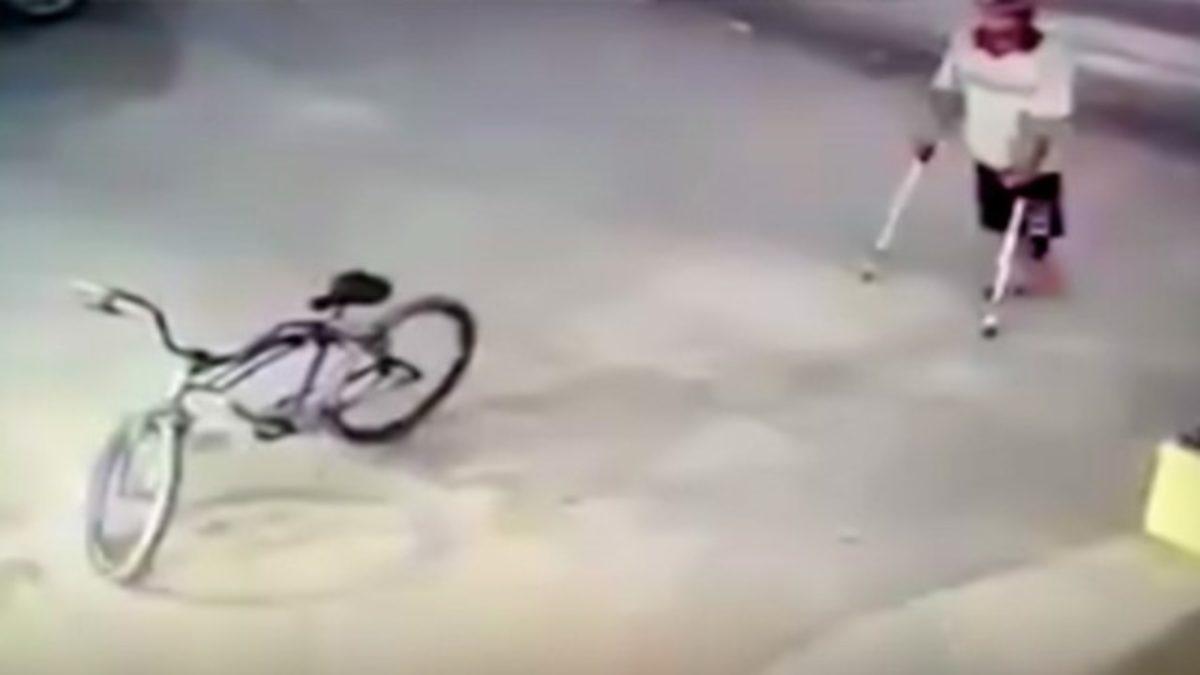 Tek bacaklı hırsız görüntülere böyle yansıdı. Brezilya’da tek bacağı olan engelli şahıs elinde koltuk değnekleriyle önce çevreyi gözetledi, ardından gözüne kestirdiği bisikleti çaldı. Şahsın bisiklete binerek uzaklaştığı an görüntülere ise saniye saniye yansıdı.