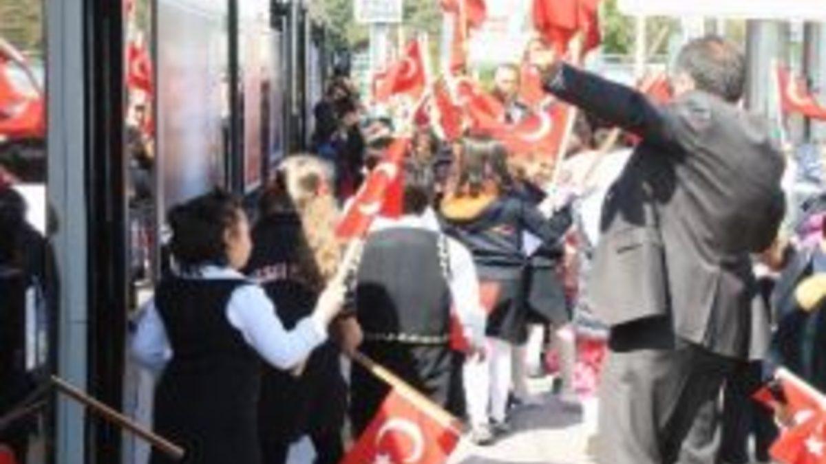 Atatürk posterleri ve Türk Bayrağı ile süslenmiş tramvay ile Cumhuriyet Meydanı’na gelen öğrenciler, Meydan Parkı önünde halk oyunları gösterisi yaptı. Öğrenciler ve öğretmenler, gösterinin ardından Mimar Sinan Parkı içerisinde yer alan amfi tiyatroya yürüdüler. Çocukları, bu güzel günlerinde aileleri de yalnız bırakmadı.