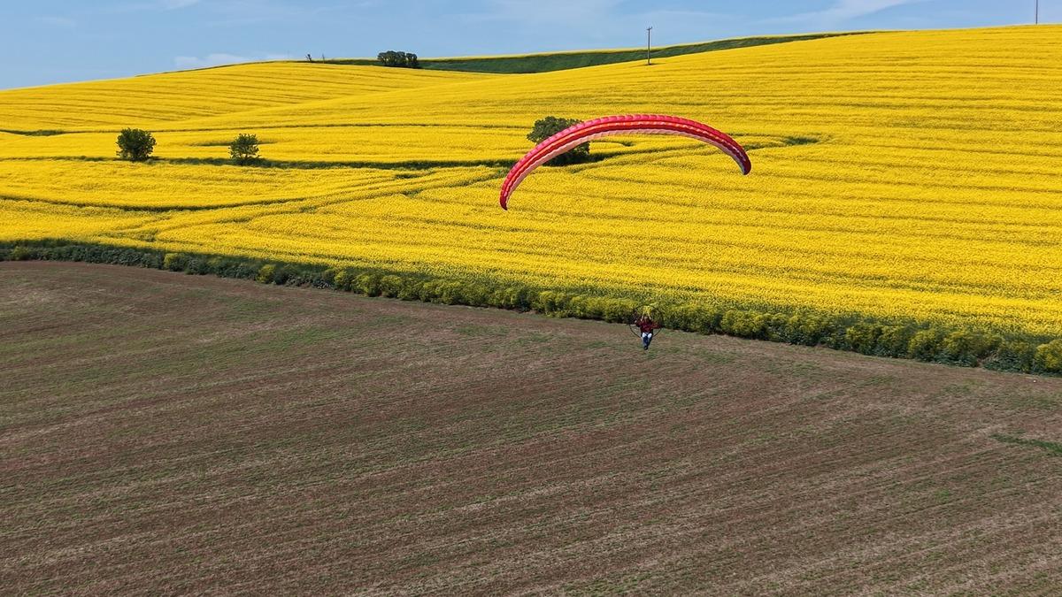 Tekirdağ'da yaşayan paraşüt eğitmeni Kadir Aksoy, bahar aylarıyla birlikte sarıya bürünen kanola tarlalarına dikkat çekmek ve farkındalık oluşturmak amacıyla anlamlı bir etkinliğe imza attı. Süleymanpaşa ilçesine bağlı Gaziköy Mahallesi'nde hazırlıklarını tamamlayan Aksoy, paramotoruyla havalanarak adeta sarı bir denizi andıran kanola tarlaları üzerinde uçuş gerçekleştirdi.