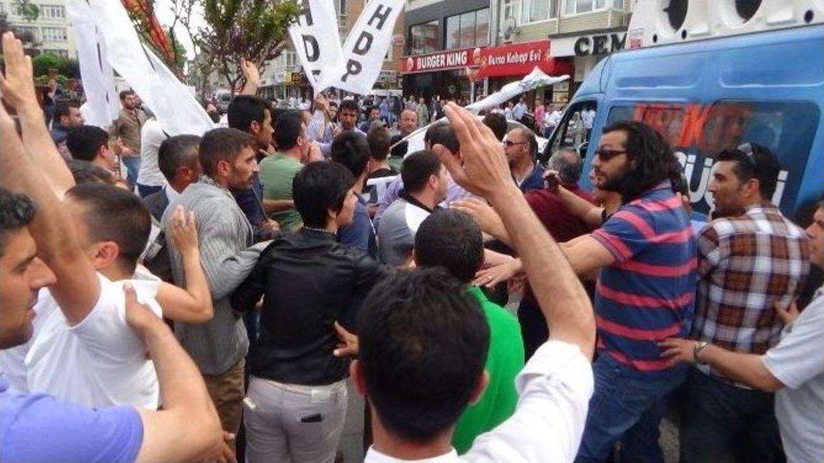 HDP’liler, Tekirdağ’ın Saray ilçesinde dün gece meydana gelen olayları kınamak için Çorlu’da basın açıklaması yaptı. Atatürk Meydanında toplanan grup, yoldan geçmekte olan AK Parti seçim aracına saldırdı.Yaklaşık 400 kişilik HDP’li grup, Tekirdağ’ın Saray ilçesinde HDP’nin seçim bürosuna yapılan saldırıyı kınamak için Atatürk Meydanı’nda toplandı. Hükümete karşı slogan atan HDP’liler, bu sırada yoldan geçen AK Parti Tekirdağ Milletvekili Adayı Metin Akgün’ün seçim aracına saldırdı. Ellerindeki bayrak sopaları ve tekmelerle yüzlerce kişinin saldırdığı aracı korumaya çalışan polislerle partililer arasında da arbede yaşandı. Bir süre devam eden arbedenin ardından HDP’li grup Omurtak Caddesi’nden yürüyerek Cumhuriyet Meydanı’na geldi. Burada basın açıklaması okuyan HDP Tekirdağ Eş Başkanı Şehnaz Kaya, Saray’da partisinin seçim bürosuna yapılan saldırının demokrasiye sığmadığını söyledi. Basın açıklamasının ardından grup dağıldı.