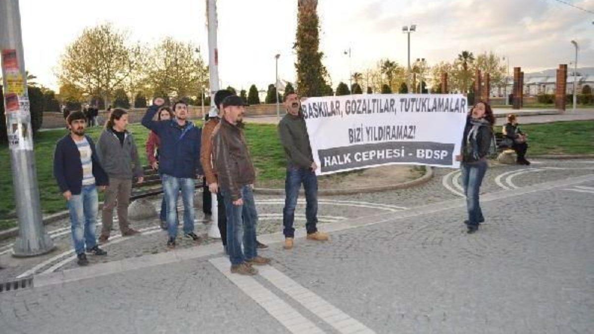 İZMİR, İstanbul’daki Çağlayan Adliye Sarayı’nda görevli Cumhuriyet Savcısı Mehmet Selim Kiraz’ın rehin alınıp şehit olduğu operasyonunda iki teröristin ve yine aynı kentteki emniyet hizmet binasına düzenlenen saldırıda bir teröristin ölü ele geçirilmesi ile bir çok kentte DHKP-C terör örgütüne yönelik operasyonda bazı kişilerin gözaltına alınmasını protesto etmek isteyen bir grup, saat 19.00 sıralarında İzmir Valiliği önünde eylem yapmak istedi. Valilik hizmet binası çevresinde geniş güvenlik önlemleri alan polis, eylemlerine son vermeyen 7 göstericiyi gözaltına aldı. Bu müdahalenin ardından yaklaşık 20 dakika sonra yakındaki başka bir noktada toplanan ve ellerinde, “Baskılar, gözaltılar, tutuklamalar bizi yıldıramaz Halk Cephesi BDSPö yazılı pankart taşıyan gruba, dağılmaları yönünde polis uyarıda bulundu. Grup dağılmayınca, polis müdahale etti. Her iki müdahalenin ardından gözaltına alınan toplam 18 kişi, sorgulanmak üzere Terörle Mücadele Şube Müdürlüğü’ne götürüldü. Polisin bölgede aldığı önlemler sürüyor.