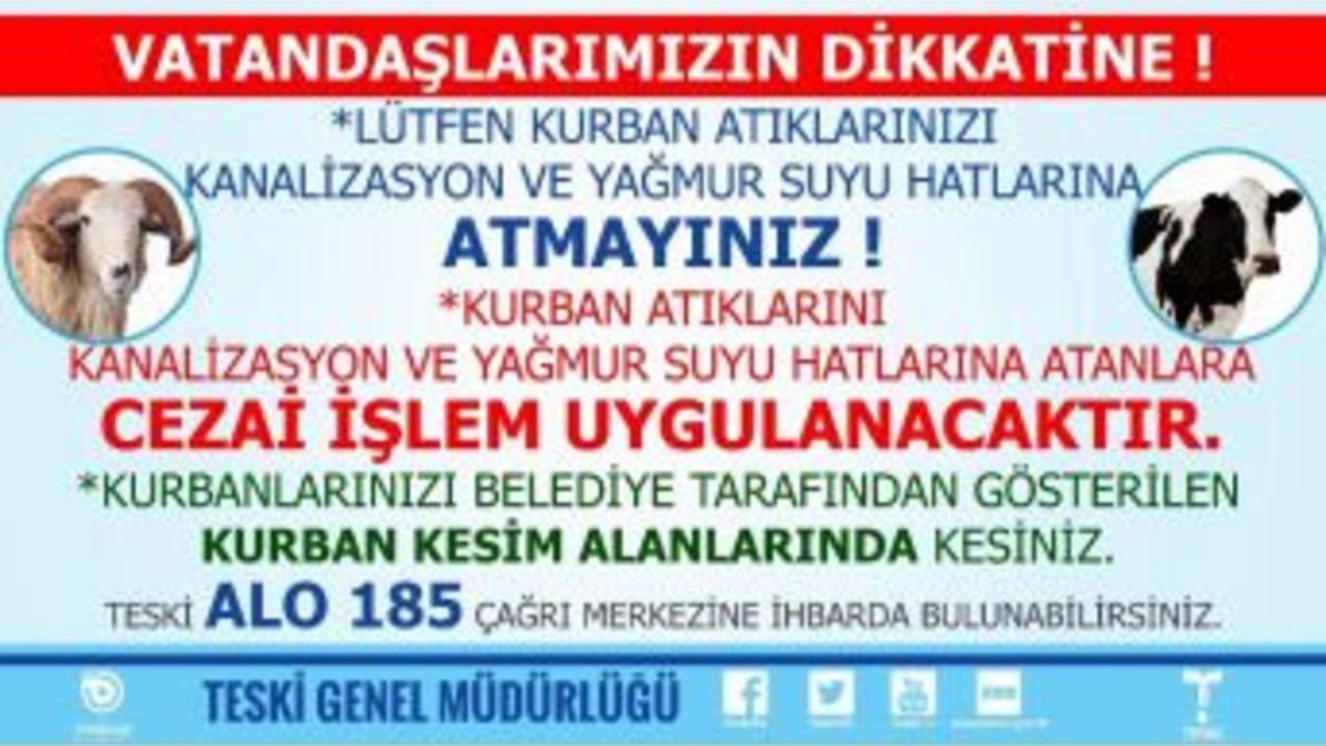 Tekirdağ Su ve Kanalizasyon İdaresi (TESKİ) Genel Müdürlüğü İdaresi tarafından kurbanlık atıkları hakkında uyarı yapıldı.TESKİ’den kurban atıkları hakkında yapılan uyarıda, “Vatandaşlarımızın dikkatin! Lütfen kurban attıklarınızı kanalizasyon ve yağmur suyu hatlarına atmayınız. Kurban attıklarını kanalizasyon ve yağmur suyu hatlarına atanlara cezai işlem uygulanacaktır. Kurbanlıklarınızı belediye tarafından gösterilen kurban kesim alanlarında kesiniz. Atıklarını kanalizasyon ve yağmur suyu hatlarına atanları TESKİ ALO 185 çağrı merkezine ihbarda bulunabilirsiniz” denildi.