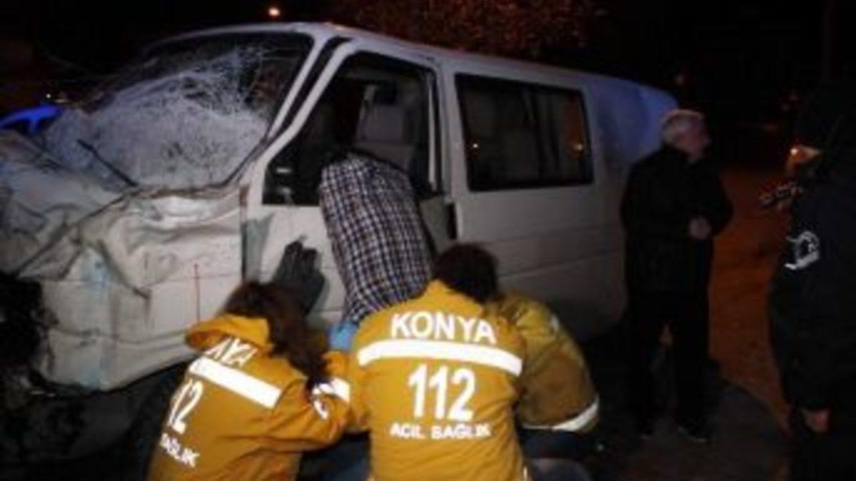Konya’da Tır ile minibüsün çarpışması sonucu meydana gelen kazada, şoför kabininde sıkışan minibüs sürücüsü itfaiye ve sağlık ekiplerinin çalışmaları sonucu çıkarıldı.Kaza, saat 03.30 sıralarında merkez Karatay ilçesi Büyükkumköprü Caddesi ile Fetih Caddesi kavşağında meydana geldi. Edinilen bilgiye göre, Büyükkumköprü Caddesi üzerinde seyir halinde olan Osman B. (40) idaresindeki 42 BSB 82 plakalı minibüs, Fetih Caddesi'nden gitmekte olan Halis P. (47) yönetimindeki 42 J 1616 plakalı tırla kavşakta çarpıştı. Çarpışmanın etkisiyle tır karşı yola geçtikten sonra dururken, minibüs yol kenarında bulunan ağaca çarparak durabildi. Kazada ayakları şoför kabininde sıkışan sürücü Osman B’nin gövdesi kapı camından dışarıya sarktı. Kaza yapan tır sürücüsü polis ve sağlık ekiplerini arayarak haber verdi. Olay yerine gelen sağlık ve itfaiye ekipleri camdan dışarıya sarkan yaralı sürücüyü sıkıştığı şoför kabininden çıkartarak sedyeye koydu. Yaralı sürücü sağlık ekiplerinin ilk müdahalesinin ardından ambulansla Konya Eğitim ve Araştırma Hastanesi'ne kaldırılarak tedavi altına alındı.Kazayla ilgili soruşturma başlatıldı.